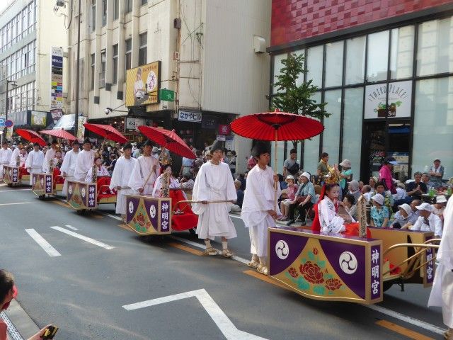 当時は法霊社の神輿行列は、市内を神幸渡御し長者山に到着後、中日には長者山で法霊社別当(現おがみ神社宮司)によって例祭が執り行われ、3日目に行列ともども法霊社に還御するという祭りでした。後にその神輿行列に対して踊りや屋台山車などを奉納する形で町民がついて回り現在の形へと繋がっていきました。