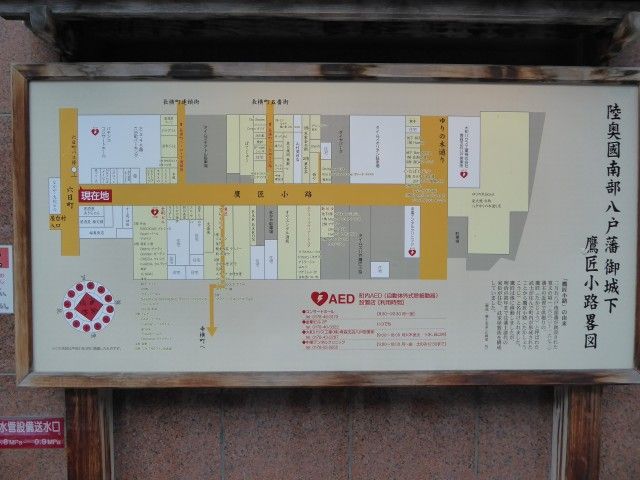 はす向かいには八戸屋台村みろく横丁入口。裏は鷹匠小路。二万石八戸南部藩が創設された寛文の頃(1660-1673)藩主の近習で供廻りの、鷹匠と呼ばれた武士が住んで町内が形成されたことから鷹匠小路と名付けられました。鷹匠は後に移動しましたが、明治の初年までは藩主譜代の家臣が住む、武家屋敷街を構成していました。(陸奥國南部八戸藩御城下鷹匠小路略図より)