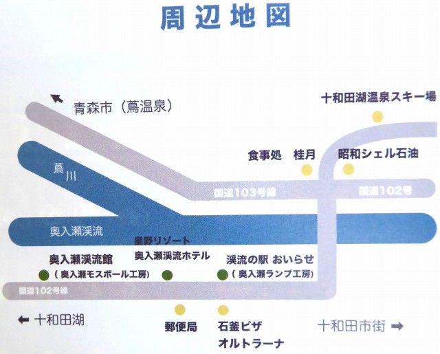 青森県十和田市大字奥瀬字栃久保。奥入瀬渓流館内。