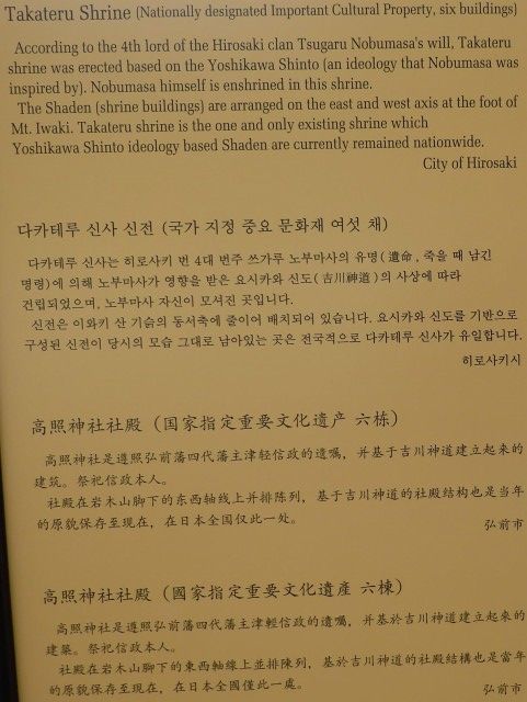 高照神社社殿(国指定重要文化財六棟)…『高照神社は、弘前藩四代藩主津軽信政の遺命によって吉川神道の思想に基づき建立され、信政自身が祀られています。社殿は岩木山麓に東西軸上に並んで配置されますが、吉川神道に基づいた社殿構成が当時のまま現存するのは、全国的にみて高照神社のみとなっています。』