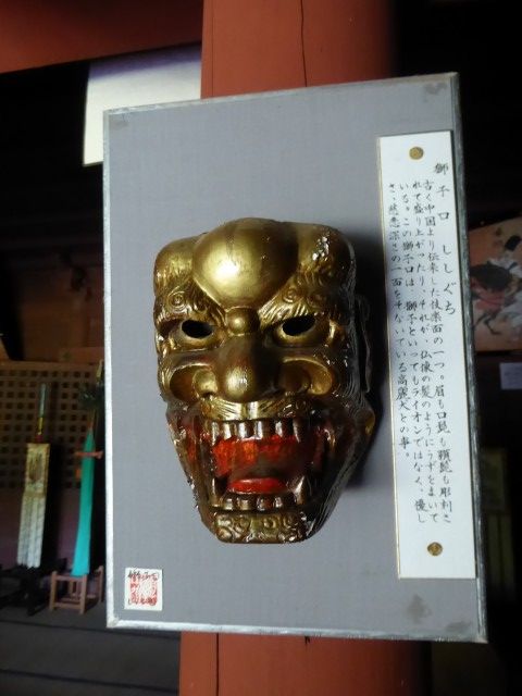 獅子口。古く中国より伝来した伎楽面の一つ。眉も口髭も顎髭も彫刻されて盛り上がったり、それが、仏像の髪のようにうずをまいている。この獅子口は、獅子といってもライオンではなく、優しさ、慈悲深さの一面をそないている高麗犬との事。