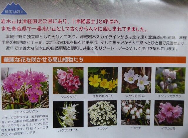 スカイライン&リフトの上空写真と高山植物。岩木山の代表花は5月下旬-7月下旬に見られるミチノクコザクラ(別名イワキコザクラ)。