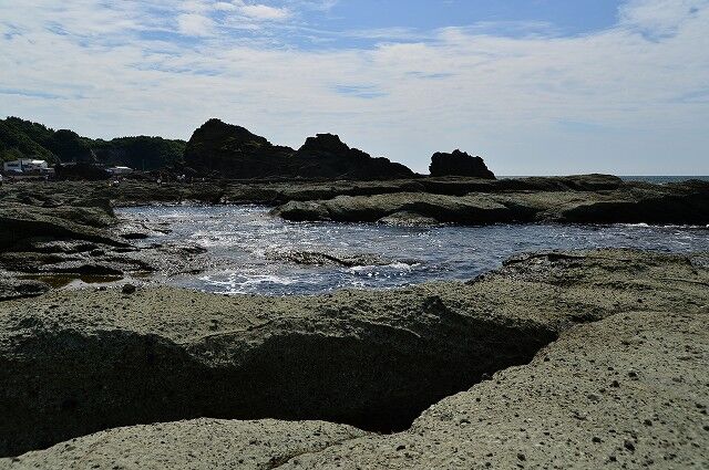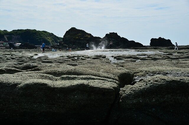 深浦町は幾度となく隆起をくり返しており、海岸線を走る鉄道や車道から、海岸段丘の階段が観察されます。千畳敷もこの段丘面の一つで、大潮の日など引き潮が激しいときには、にわか千畳敷が沢山観察されます。波の強い日には浅瀬の淵に波が立って、高い段丘面の上から観察すれば千畳敷のような地形が幾つもあることに気付きます。