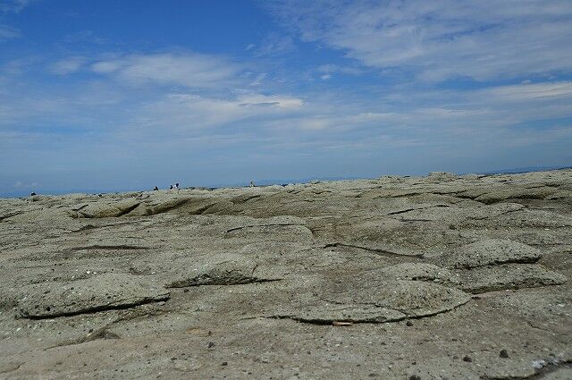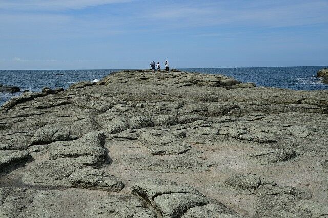 千畳敷の平らな部分の岩は明白緑色、付近の奇岩は黒鉱鉱脈と関連するグリーンタフ。秋田県から青森県日本海側を経て北海道渡島半島まではグリーンタフが発達し、火山活動や地震が多かった場所で、歴史地震の記録も多く、近年プレートの境界が発見されるなど地殻変動の激しい場所です。