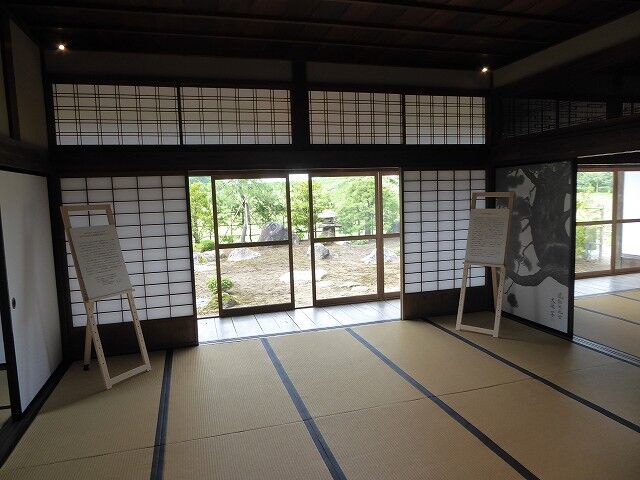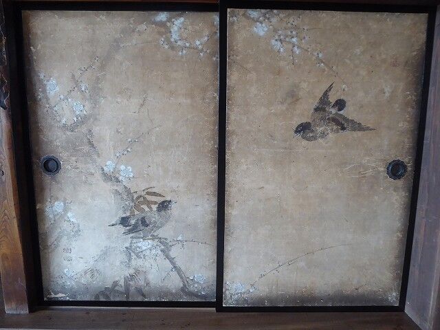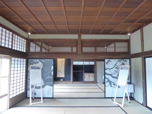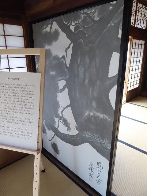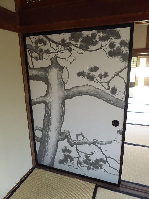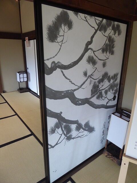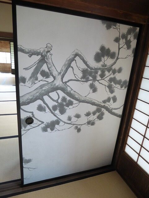 襖絵の複製について…『旧石戸谷家住宅の復元工事に伴い、襖等の建具の修復を行いましたが、襖はオクザシキの一部を除き、ほとんどが戦後に張替されたものとなっていました。そのため大半は無地の襖紙へと張替を行っています。その中で、石戸谷家の方より、住宅を市へ寄贈する前に、ナカザシキ北面の襖絵については、菩提寺の鳳松院に寄贈しており、復元工事に際し再移設できないか、とのお話がありました。弘前市では鳳松院のご協力を得て、この襖絵の調査を行い、鳳松院第29世住職で、弘前美術作家連盟委員長等を務めた、洋画家の黒滝大休氏の作で、鳳松院の境内にある松を題材としていること、また、絵の状態は良好であるものの、四曲一双の屏風に打ち直しされていることなどが判明しました。この調査の結果から、市では鳳松院との関係等の歴史的経緯と、襖絵への再復元等の技術的課題等から、原本の移設ではなく、デジタル技術による複製作成を行い、再び襖絵として再現することとしました。』
