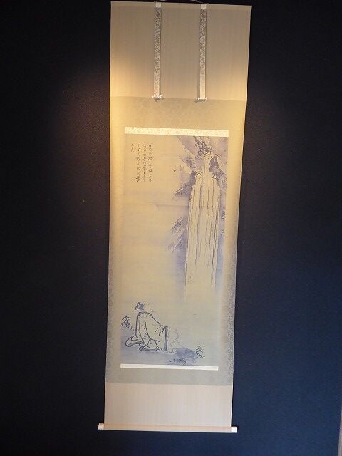 掛け軸「高士観瀑図」(複製)弘前藩三代藩主津軽信義筆、弘前市立博物館所蔵。中国の詩人・李白が詠んだ『望盧山瀑布』の情景を描き、「日照香炉生紫煙 遥看瀑布挂長川 飛流直下三千尺 疑是銀河落九天」を書き添えています。信義は宮廷歌壇の中心の中院通茂の門人となり津軽の歌道を振興し、自らも「愚詠和歌集」を編むなど、高い教養を身に付けていたことが知られています。