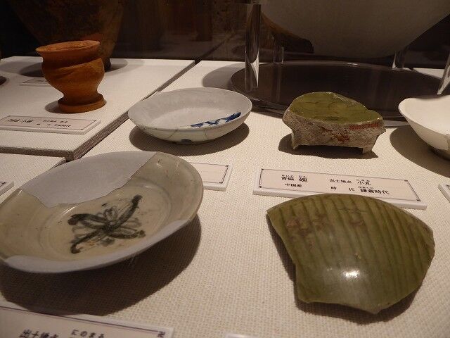 堀越城の歴史を語る出土品…『【Ⅰ「堀越城」以前の堀越】…過去の発掘調査では、本丸・二之丸・三之丸の各地区から、縄文時代から平安時代にかけての土器などが出土している。明確な地面の痕跡(遺構)が伴うようになるのは、弥生時代中ごろである。この頃は国史跡垂柳遺跡(田舎館村)などで大規模な水田跡が見つかっており、津軽平野南部で広く水田稲作が試みられたと考えられている。次に明確な遺構が確認されるのは飛鳥時代の終わり頃で、三之丸からは津軽地方で検出例の少ない竪穴建物跡が確認されている。なお、平安時代になると城内全域で遺構や遺物が確認されるようになる。【Ⅱ堀越楯から堀越城へ】…鎌倉時代から、堀越楯(館)が築かれたとされる南北朝時代にかけての陶磁器が、城内から出土している。なお、奥州藤原氏の時代(平安時代の終わり頃)の希少な中国産の白磁も出土しており、この頃から城内に何らかの施設が存在した可能性もある。その後の室町時代には継続的に陶磁器が出土するが、1500年代に入ると、急激に出土量が増大する。特に為信が活動し始める1500年代後半からは遺物の質・量ともに充実する。この頃は、瀬戸・美濃(愛知県・岐阜県)や越前(福井県)などの国産の陶器のみならず、遠く国外(中国・朝鮮半島)から運ばれた陶磁器も多量に出土する。【Ⅲ古城の時代】…1611年(慶長16年)、二代藩主津軽信枚が弘前城へ引っ越しする際、堀には屋根材や建築部材など、大量の木製品が廃棄された。この廃棄層には、金箔押の武具や、鋸や刀を模した形代なども含まれており、何らかの儀式行為が行われた可能性もある。城として使用されなくなった江戸時代には、遺物量は急激に減少し、堀へ流れ込む木製品の他、少量の陶磁器が出土するのみとなる。』