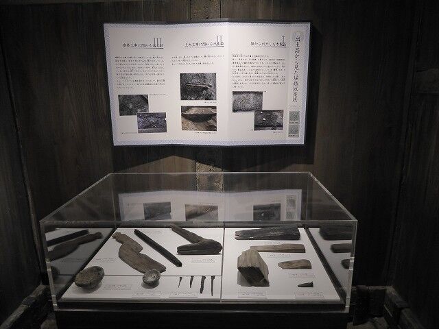 出土品から見た堀越城築城『【Ⅰ堀から出土した木製品】…堀越城の堀からは大量の木製品が出土する。特に、堀底の少し上に堆積した層からは、屋根材や建築部材、道具類など大量の木製品が出土する。これらの木製品は、出土する陶磁器の年代と、建物の柱材などの大型のものがなく、壊れている製品も多いことなどの様相から、1611年(慶長16年)の弘前城への引っ越し時に、廃棄されたものと推定される。なお通常、土などに埋まった木製品は、時間とともに腐り、失われる。しかし、堀内には地下水位が高く、外気から遮断された湿潤な環境にあるため、400年を経てもなお、多くの木製品が腐らずに残っている。【Ⅱ土木工事に関わる出土品】…土を掘ったり、盛ったりする道具として、鍬の柄のほか、スコップのように用いる鋤が出土している。また、下草などを刈ったと思われる鎌の柄も出土した。【Ⅲ建築工事に関わる出土品】…建物などを建てる際に用いる製品として、柱と貫や梁などを固定する際に、部材の間に打ち込む楔が出土している。大小様々な大きさがあることから、用途に応じて使い分けされていたようだ。また、柱材の一部や、釘なども出土している。柱材は、途中で折れているものだけが出土しており、再利用が可能な長い部材などは、次の弘前城へ運ばれたものと推定される。なお、二之丸では金属を熔かす「るつぼ」や、鍛冶工房の跡が見つかっており、城内では金属製品の生産や再加工も行っていたようだ。』