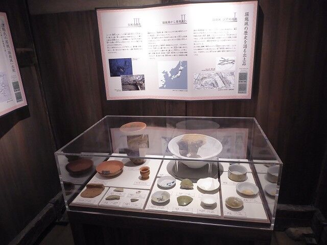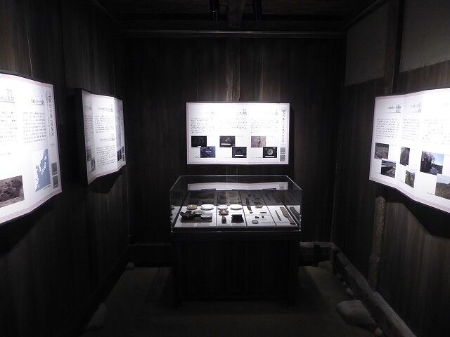 展示エリアへ。かつてのウマヤです。「為信と堀越城」、「堀越城とは」、「発掘された堀越城」、「城内の様相」、「よみがえる堀越城」、「企画展示」という6つのコーナーがありました。天井には床を兼ねた板が置かれており、かつては飼葉置場や刈子(作業員)の寝泊まりの場に使用されていたようです。それでは一部だけ紹介します(順不同)。