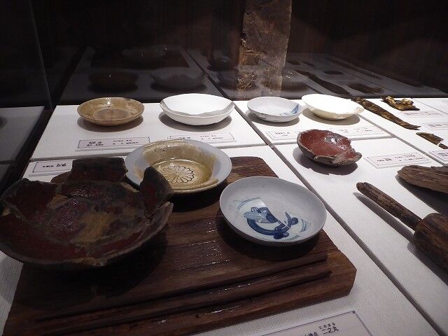 城内の暮らしを映す出土品『【Ⅰ食と生活の風景】…城内からは、当時城内で使用されていた器のかけらが多数出土する。碗や皿などの食器としては、中国江西省景徳鎮などで生産された、陶石を原料とする白磁や染付などの磁器、そして現在の愛知県や岐阜県などで生産された陶土を原料とする陶器が使用された。また、擂鉢などの調理具、壷や甕などの貯蔵具には、現在の福井県などで生産された陶器が使用された。その他、桶や樽、曲物などの木製品も使用されている。なお、天目茶碗や茶臼なども出土しており、城内では「茶の湯」も嗜まれていたようだ。【Ⅱ戦の風景】…城内からは戦争に関わる出土品として、鉄砲玉や、小札と呼ばれる鎧の一部などが出土している。特に、本丸からは鋳型から取り出したままの、連結した状態の鉄砲玉が出土しており、当時の製作過程を示す出土品といえる。なお、二之丸の外堀からは、下あご(下顎骨)のない、成人の頭骨のみが出土している。弘前藩官撰史書「津軽一統志」には、家臣による反乱の記録も見られることから、その痕跡となる可能性もある。【Ⅲ祈りの風景】…1611年(慶長16年)の引越しの際、堀内に廃棄された品の中には、何らかの祀りや祈りに使用されたと考えられるものがある。内堀からは、壁に懸ける仏像である懸仏や、木で作られた鋸(形代)などが出土している。なお、同じく内堀から出土した金箔押の武具は、非常に精巧なものであるが、籠手と思われる部分のみが本丸東門の前で出土しており、単なる不要物の廃棄ではなく、地鎮などのために意図的に堀内に置かれた可能性がある。』