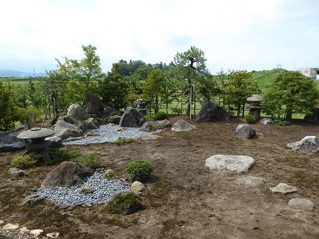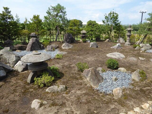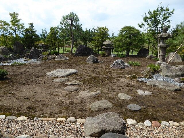 大石武学流庭園について…『大石武学流庭園は、江戸時代末期から近・現代にかけて、津軽地方を中心に盛行した日本庭園の地方様式です。流派には茶道の家元制度に似た「宗家制度」が存在するほか、庭石の配置、石造物の造形などに強い規則性が存在するなど、極めて独自性、地方性の強い庭園様式といえます。石組では、飛石列を「V字」に配することが多く、一方の先には「礼拝石」、もう一方には蹲踞(手水前)を配します。また、蹲踞に対置する位置には「二神石」を配します。礼拝石の先には枯山水または池泉を、その奥に築山と滝石組を設け、その奥に深山石、最奥部に遠山石を配します。石造物では「野夜灯」と呼ばれる自然石を組み合わせた灯籠を用いるのが特徴的です。大石武学流庭園では、飛石列から礼拝石、池、築山・滝石組へと延びる鑑賞上の軸線と、その軸線を挟んで蹲踞と二神石が対置する空間構成という、2つの「決まりごと」が、順守されています。今回整備する本庭園についても、これらの「決まりごと」は順守されていますが、全体的に小さめの庭石、比較的簡素な築山・滝石組や植栽など、大石武学流庭園の中でも古手(明治時代前半頃)の特徴を示す作庭を行っています。』