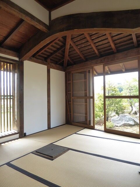 建物は文政5(1822)年の建築と伝えられていますが確実な証拠はないようです。当家に安政6年(1859年)の普請中諸払帳が残されていることや、木部の風食などからみて江戸時代末期の建築と推定。後世における改造が少なく、江戸時代の豪農建築を知るうえで貴重な建物であることから、昭和60年に弘前市指定有形文化財に指定されました。その後、平成16年に弘前市に寄附されましたが、老朽化が進んでいたため、平成21年度に解体保存。平成27~30年度までの4年間をかけて移築復元工事を行い、令和元年度に内装工事、令和2年4月に全面公開されました。
