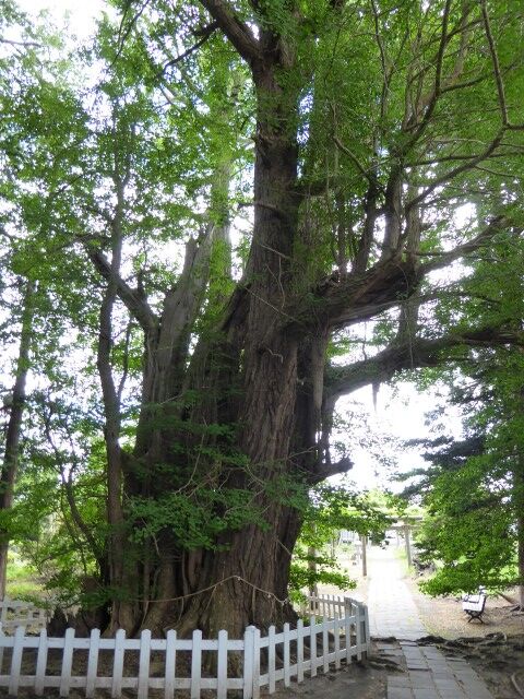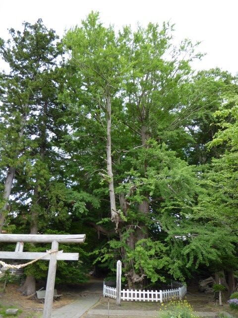 二の鳥居の向こうにいちょうが見えます。青森県指定天然記念物。樹齢1100年以上、幹周16m、高さ32m。