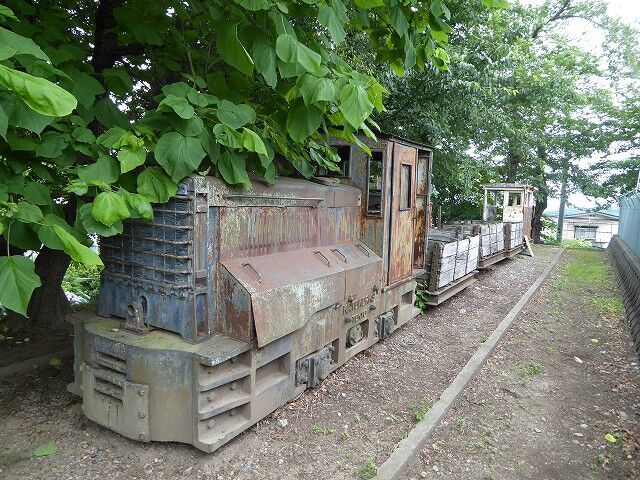 近代産業のシンボルとして八戸市松館から階上町金山沢にかけて八戸石灰鉱山があります。江戸時代から既に採掘しているといわれる石灰採掘所は、新井田川口に日出セメント株式会社が設立された大正10年から本格的に始まりました。現在は国内有数の露天掘り鉱山として年間約500万トンの生産量を産出。長年の採掘から全国唯一の海面下の巨大な採掘穴を形成。その雄大な景観から八戸キャニオンの名称で呼ばれています。10kmに及ぶ八戸港までの原料の運搬は、大正から昭和初期にかけては馬車トロッコ、その後は陸上をトロッコで運びました。昭和48年に地下ベルトコンベアーが完成し、その後の粉塵・騒音等の公害防止に配慮が施されています。その地下トンネルは山元貯鉱場から妙字蟹沢、旭ヶ丘団地付近を通り、湊高台付近で新井田川下流にある八戸セメント株式会社に分岐し、白銀町字昭和町にある港頭まで続いています。この石灰採掘所は北東北の近代工業の出発点であり、近代産業の象徴としてあり続けています。現在もトロッコ線の跡が所々に残されており、松館川西側には道路と水田の間に3m幅程の緑地帯が籠田方面まで続きますが、これもその跡地です。当時使用されていた機関車やトロッコが松館小学校と新井田小学校の校庭に保存されているわけです。