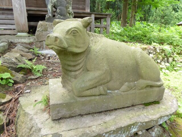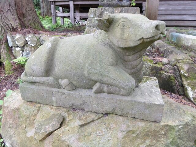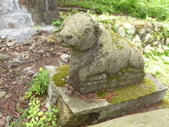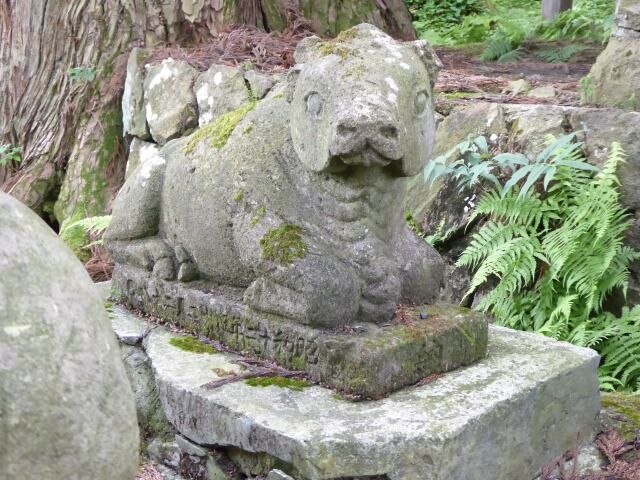 小さい牛の後ろに狛犬一対(紀元2600年亥年生42歳記念)。