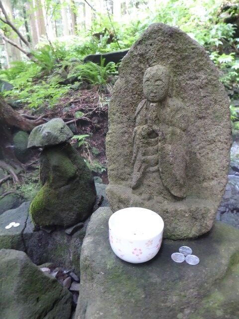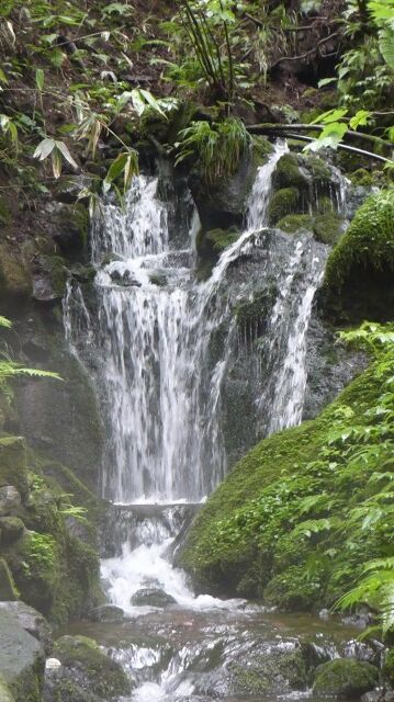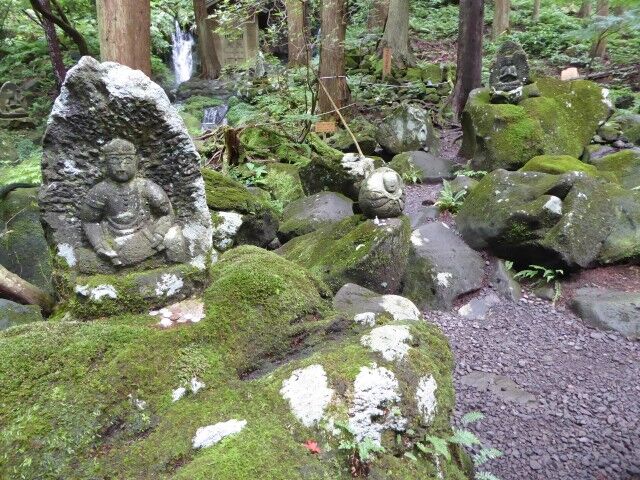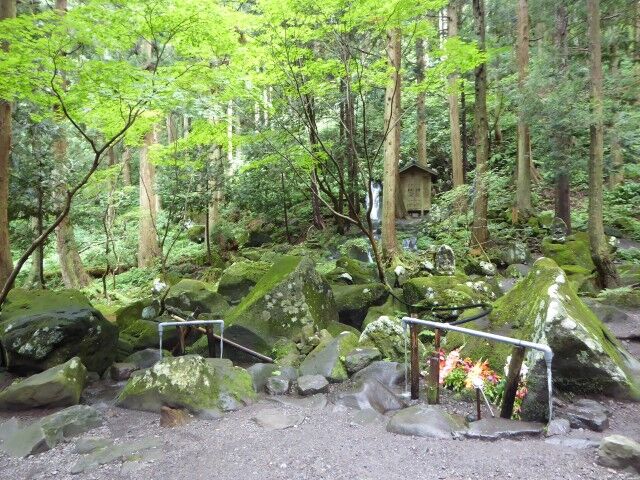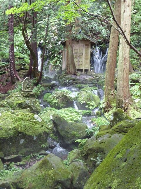 遊佐町HPより…『町中のいたるところに湧水が湧き出る遊佐町ですが、その中でも地域住民のみならず、遠方からもおいしい水を求めて、人々が集う場所がこの胴腹滝(どうはらたき)です。週末には、大きなタンクやペットボトルを抱えたたくさんの人々が集まり、その人の列は、平日でも、真冬でも途切れることはありません。「胴腹滝」という変わった名前の由来は、鳥海山の伏流水が山腹から湧き出している様子を、身体の「どうっぱら」から湧き出しているという例えで名づけられました。また、このことから、安産の神としてもあがめられております。この滝は、道路から歩いて5分足らずの場所にあります。杉林の中に小さな杜があり、その杜を挟んで二つの滝があります。左の滝は冷たくコーヒーに合うと、右の滝はまろやかな清水で日本茶に合うと言われ、通の人々は飲み分けて利用している様子です。遊佐町に訪れたら必ず飲んでみたい湧水です。この滝は、道路から歩いて5分足らずの場所にあります。杉林の中に小さな杜があり、その杜を挟んで二つの滝があります。左の滝は冷たくコーヒーに合うと、右の滝はまろやかな清水で日本茶に合うと言われ、通の人々は飲み分けて利用している様子です。遊佐町に訪れたら必ず飲んでみたい湧水です。胴腹滝は、山形県里山環境保全地域第1号に指定されました。里山は、日々の暮らしの中で、人々が自然に働きかけ、手を加えながらも、自然との調和を保ってきた空間です。つまり里山は、持続可能な社会の優れたモデルなのです。水が断崖から勢いよく湧き出し滝となる胴腹滝の景観は、沢水が断崖から流れ落ちる一般の滝とは異なり、自然現象としても価値ある滝です。胴腹滝周辺の湧水は、横堰によって集められ、さらに小水路に導かれ、集落の生活用水となり、田畑の灌漑用水となりました。胴腹滝の豊かで良質な水は下流域の人々の暮らしを支え、信仰の対象ともなってきました。人々の心のよりどころとして、かけがえのない恵みをもたらすこの地域は、これからの世代に継ぐべき大切な財産です。胴腹滝の清水は、滅菌消毒もされていない天然の水です。十分気をつけて飲用ください。』