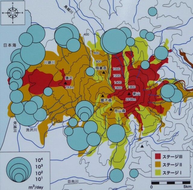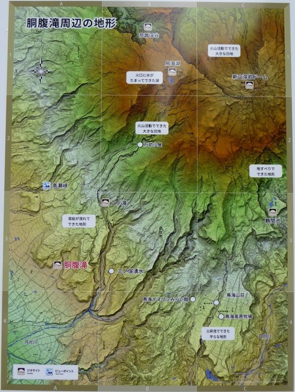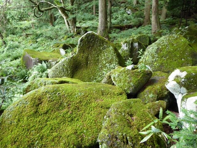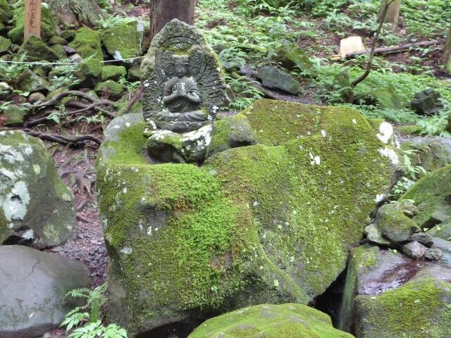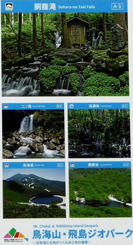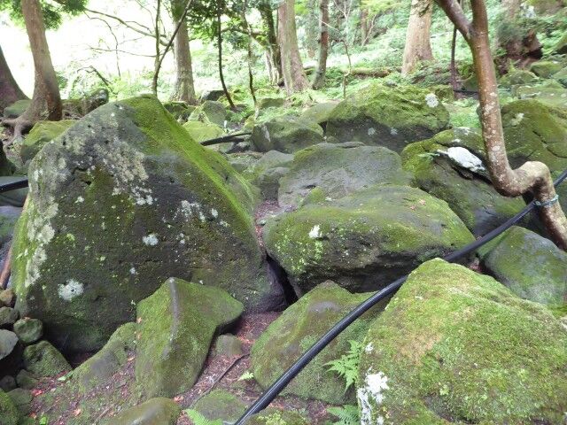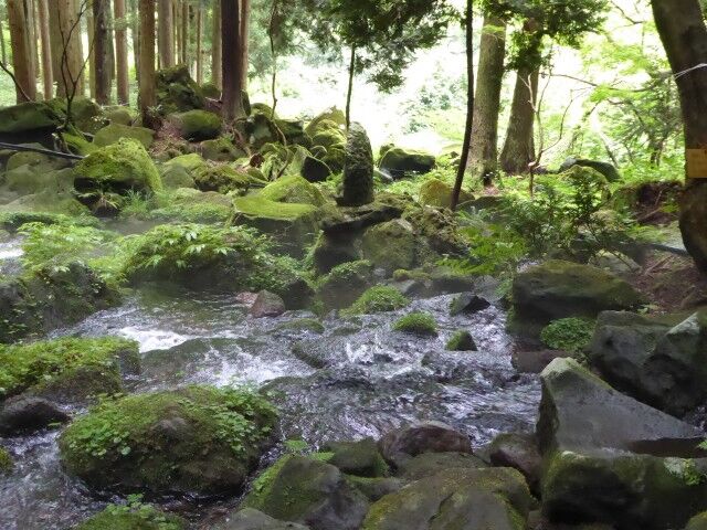 案内板「胴腹滝-自然と人がつくった湧水の滝」より…『鳥海山は約60万年にわたって活動を続けてきた活火山です。その間、何度も噴火を繰り返し、ときに山体が大きく崩れることもありました。鳥海山には、火口から流れ出た溶岩がつくり出した地形が広い範囲にみられます。溶岩は巨大な岩のかたまりのように見えますが、じつは溶岩の内部には、たくさんの割れ目があります。また、溶岩は空気や地面に冷やされながら流れるため、その表面や底面には大小の岩がたくさんつくられ、ガサガサしてたくさんの隙間ができています。鳥海山に降った雨や雪解け水の多くは、このような隙間や割れ目などに浸透し、長い年月をかけて、湧き水となって地上に現れます。鳥海山の湧き水の多くが溶岩の末端部に見られることは、溶岩と湧き水の密接な関係を示しています。鳥海山南東麓、標高約230mに位置するここ胴腹滝もそのひとつで、周囲の溶岩は今から約10万年前に山頂付近から流れ出たものです。胴腹滝の湧き水は、水汲みに訪れる人が絶えない人気の名水です。胴腹滝をよく見ると、山の斜面から湧き水が滝のように流れ出していることがわかります。「胴腹」の名称も、まるで身体の胴部から湧き水が流れ出ているような様に由来しています。ここは、明治時代には修験者の行場とされた場所で、地域の方々によって、胴腹滝の水が苔むした岩の間を流れるように整地され、大切に保全されてきました。そして今もなお、地域の方々の信仰に支えられた美しい風景が息づいています。』