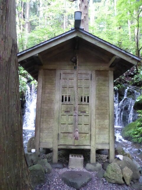 パンフレットより…『水汲み人気スポット。名前の通り、鳥海山の伏流水が山腹から湧き出ています。安産の神としてあがめられています。杉林の中に小さな社があり、社をはさんで二つの滝があります。左の滝は冷たく、右の滝はまろやかな清水と言われています。カルシウム・マグネシウムの硬度が低く、くせがない。コーヒーや、この水でご飯を炊くとおいしい。』