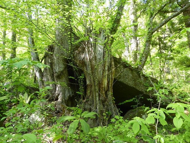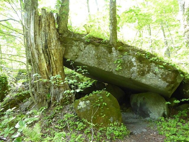 石ケ戸…『「ケ戸」とは、この地方の方言で小屋を意味する。つまり「石ケ戸」とは石でできた小屋、いわゆる岩屋を意味している。実際、大きな岩の一方がカツラの巨木によって支えられて岩小屋のように見える。昔、鬼神のお松という美女の盗賊がここをすみかとし、旅人から金品を奪っていたという伝説がある。』