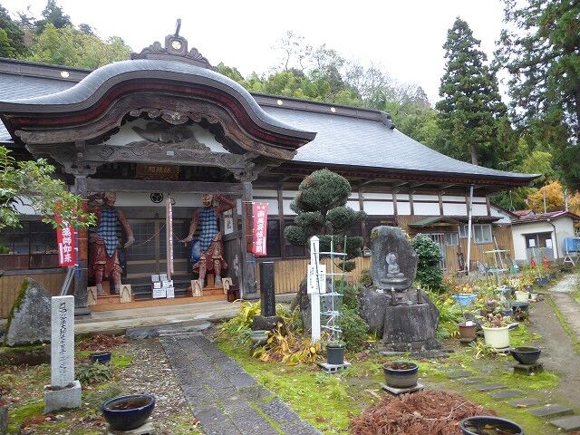 龍頭寺の十一面観音…『「町文」十一面観音・像丈360 不動明王・像丈91 毘沙門天・像丈97センチ。龍頭寺は観音堂に十一面観音を祀るが、仏教伝来より多くの人に信仰される観音菩薩は、人々を救うため33身に変化するとされ、中でも十一面観音はあらゆる方向に顔を向け、苦しむ衆生を見落とすことなく救う誓願を表しており、観音菩薩が多くの顔を持つことは、極めて素直に民衆に受け入れられ、平安時代頃から観音信仰の主流を占めていた。観音堂に入ると、まず中央の京風で美しい総丈1.8mの前立ち十一面観音に迎えられるが、この像は光背鏡の裏に江戸時代の鏡師である上嶋和泉守の記銘があり、及瑞住職が明治15年に庄内三十三観音霊場の19番札所更新記念に購入した尊像で、その奥に松岳山観音寺時代の本尊で、像丈3.6mの松一本で鉈彫様式の十一面観音立像が、不動明王と毘沙門天を両脇に従え祀られており、十一面観音を本地佛とした熊野神社との関連や上寺三十三坊の創設など、開創当時の観音信仰を想わせる尊像である。この三尊形式について「山門堂舎記」に、平安時代に唐より帰る際に海難に遭った日本天台宗の僧円仁(慈覚大師)は、どうしても大陸で学んだ密教を日本に持ち帰らねばと、一心に聖観音の力を念じたところ、毘沙門天が現れて難を逃れ無事に帰国出来たことから、比叡山横川の首楞厳院に聖観音と毘沙門天を安置し、後に不動明王を加え祀ったとある。つまり、千手観音とその信者を護る神々の力を結集した、神聖なる集団の二十八部衆など、観音菩薩を守る者には幾つかあるが、龍頭寺の十一面観音は眷属として共に松一本で鉈彫の、宇宙の根本仏である大日如来の化身で、その教えを司る教令輪身としての不動明王を向かって右側に、また左側には四天王の一人で多聞天とも呼ばれ、北方を守る武運神で財宝神でもある毘沙門天を祀るが、その力は何れも絶大で無双の力を放つ最強の守護者の脇仏には、そうした仏達への大きな期待が込められていたと思えるが、観音菩薩におけるこの三尊様式はいずれの経典にも記されていない。しかし、西国観音結願霊場の谷汲山華厳寺の三尊仏など、十一面観音および不動明王と毘沙門天の三尊様式の造像例は意外に多く、いずれも不動明王と毘沙門天が、観音菩薩の眷属として初めから造像されたかは不明だが、この両尊は観音菩薩の脇侍に留まらず、阿弥陀三尊の眷属としても祀られている。そのうえで円仁(慈覚大師)は、平安時代前期の延暦13年(794)に下野国で生まれ9歳で仏門に入り、15歳で比叡山に登り受戒するや承和2年(835)に入唐留学し、天台教学を学び承和14年(847)に帰朝して天台密教の教学を確立すると、斎衡元年(854)に天台座主第3世となるのだが、龍頭寺の住職としてこれらより考察するに、龍頭寺が松岳山観音寺として大同2年に開創された当初より、この三尊様式で十一面観音を祀ったとする説にはやや疑問がある。』