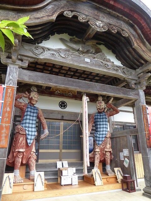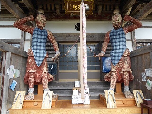 龍頭寺の仁王尊…『「町文」木製(寄木造)年代不詳(江戸中期)各尊身丈330像幅57センチ。龍頭寺は、今から1200年前に創建された松岳山観音寺が始まりで、その本尊が十一面観音だったことから、上寺(うわでら)集落には三十三観音の信仰に起因して、33の宿坊が作られたといわれ、その本寺であった龍頭寺には、本堂玄関に木彫で高さ3.3mの阿吽一対の仁王尊が立っており、昔から子供の麻疹(はしか)が軽く済むようにと、阿形は左回りに吽形は右回りに、それぞれ前方から中央に向かい、股くぐりを3回して子供の成長を願う風習がある。奈良時代の初めに、中国の文化と共に仏教を取り入れた日本人は、それまでの神の信仰を守るため、神仏習合という考えを打ち立てて、仏と神を分け隔てなく信仰したことから、鳥海山は薬師如来が大物忌神として仮の姿になって現れ、人々を救うのだとしたため、鳥海山およびその神を祀る大物忌神社は、別当職を務める龍頭寺が長い間にわたり、管理と運営に当たっていたが、明治初年の寺と神社を分けなさいとした新政府の神仏分離の発令が、地方を中心にいつしか寺を無くして神社を建てろとする、廃仏毀釈の考えに内容が変わってしまう。そのため、神社と繋がりを持つ多くの寺院は、廃寺や規模の縮小を余儀なくされ、上寺の全ての家は集落を守るために、強制的に神道に宗旨を変え龍頭寺から離れたが、上寺集落の人々は千年以上の長い歴史を持つ龍頭寺を無くす訳にいかないと考え、幕末に龍頭寺の本堂として再建した堂宇の学頭坊敷地のみを龍頭寺の境内とし、それまで龍頭寺が管理していた土地や建物は大物忌神社に移管した。こうした廃仏毀釈の複雑な様子について逸話では、「明治という新しい時代になり、寺と神社を分けなさいという話を聞いた上寺の仁王さまたちは、自分たちの居場所がついに無くなったことに気づき、或る夜ついに今まで自分たちが居た仁王門から抜け出て、これからの自分たちの居場所を探すため、幾日も幾日も上寺の部落中を彷徨ったそうだ。そうした或る夜、仁王さまたちはとうとう疲れ果ててしまい、道端に腰を下ろしウタタ寝をしてしまったが、しばらくすると朝日が昇り急に辺りが明るくなったのに気付き、驚いた仁王さまたちは我に返り立ち上がって見回すと、そこは良く見慣れた龍頭寺の本堂玄関だったので、それからは向かって右側に阿形と左側に吽形の仁王さま二人が、ずっとここで仏さまとお寺を守っているのだ」という。つまり龍頭寺の仁王尊は、初めから寺の本堂玄関に祀られていた訳でなく、神仏分離により明治6年(1873)に仁王門(現随神門)より移された尊像で、その際に天衣などの装飾類は失われてしまったが、一般に金剛力士とか仁王様と呼ばれるように、筋骨隆々な姿をし半裸で身構える憤怒武者風の型像が多いが、龍頭寺の仁王尊は細身にして腰をひねらず直立し、どことなく笑みを浮かべるユーモラスな姿をしており、独特な雰囲気を持つ数少ない尊像の一つである。また仁王尊は、金剛杵を持つことから執金剛神とも称され、仏法や諸尊を守護する夜叉神で、諸経典には釈尊の周囲に常に侍して金剛杵をとると説かれ、元来は単尊で釈尊の警護に当ったが、やがて仏尊および聖域を守護するため阿吽一対に分化し、始まりと終わりの時間を超越して表しており、さらに仁王尊の多くが朱色なのは、中国では古来より朱や赤などの色には、魔除けや病魔を払う力があるとされ、仏教伝来と共に日本でもその風習が受け入れられ、この色が諸々な災いを避ける意味合いを込め神社仏閣で多く用いられ、龍頭寺の仁王尊も全身を朱色に塗彩してある。』