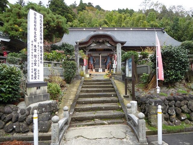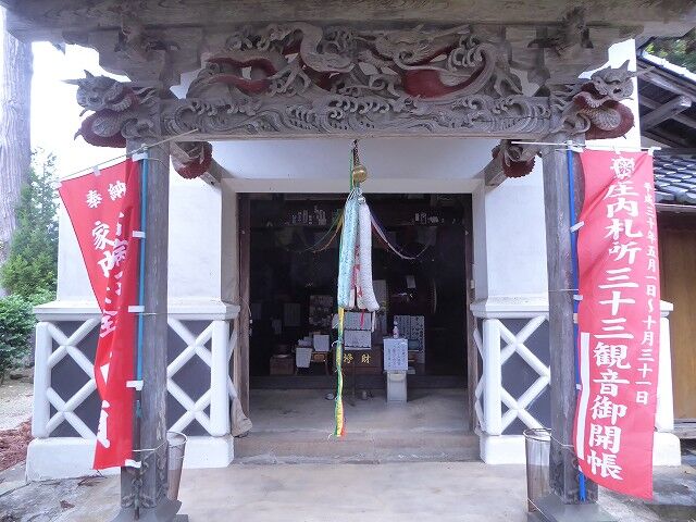 庄内札所三十三霊場(庄内三十三観音霊場)十九番「鳥海山龍頭寺」十一面観世音…『開山:慈照上人。堂宇:本堂・庫裡、開山堂、観音堂。本尊:薬師如来。寺宝:涅槃図、三千佛曼荼羅、木造阿弥陀如来坐像、黄檗版一切経。本寺:京都智積院。末寺:ニヶ寺。この寺は遊佐町蕨岡の上寺にある。ここは鳥海山蕨岡口に当たり、すぐ近くには守護神たる大物忌神社がある。また下には桜で名高い鳥海公園もその近くにある。飽海平野や煙突が林立する酒田港を一望におさめることが出来る観光地としても、眺望と自然美とに恵まれているので年中参拝者で賑わっている。當寺は醍醐天皇の御代に三宝準宮の末寺として新義直公(しんぎなおきみ)という人が松岳山観音寺として開基せられたものと言い傳えられている。本尊薬師如来は以前鳥海山の本地仏だったといわれ、出羽一の宮大権現とよぼれている。竜頭寺は最上時代一山三十三坊の学頭で、領主最上氏の尊信を受け、二十年ごとの造営にあたっては、杉松材二十石ないし三十石の寄進を受けた。享保(1716~1735)のころ中興深開法印に黄壁版一切経をそなえつけるほか、訪れる学僧のため四十俵あがりの田地を用意するなど教学振興につくした。この法印の経歴ははっきりしないが、大石良雄の二男吉千代だという説もある。明治維新の神仏分離のさい、古文書、刃剣をはじめ由緒あるものは大物忌神社に移された。当寺観音は作者は不明であるが銅製の立派な御尊像である。また当寺は常法談林学頭寺として昔は栄えた寺である。』