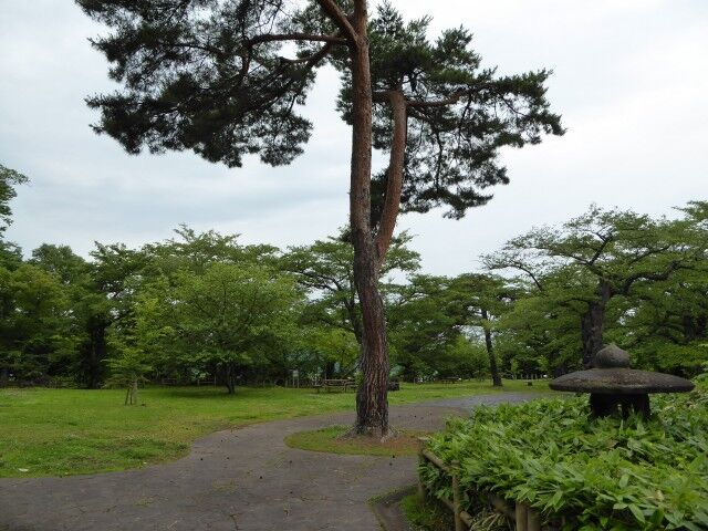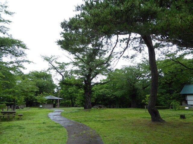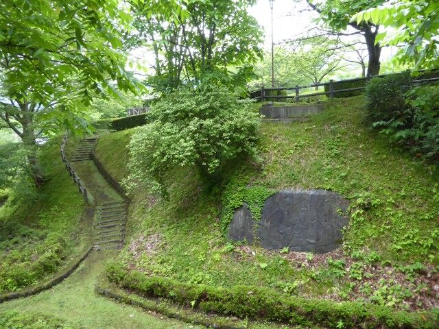 標柱より…『ゆるぎ館と共に北方の防備施設である。空堀跡、土塁跡、腰郭、また家中武士の鉄砲調練場跡などがある。明治30年盛岡桜山神社を分社し、また戊辰の役やその後の戦役の戦没者の「招魂碑」「忠魂碑」がある。桜山公園ともなっている。平成5年5月再建鹿角市花輪史談会』