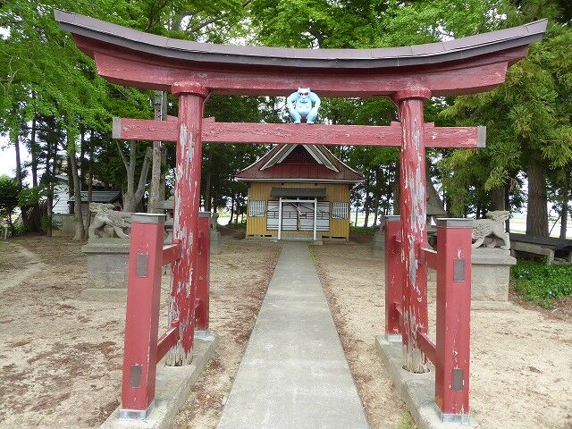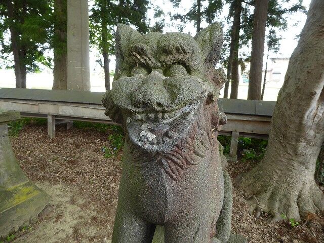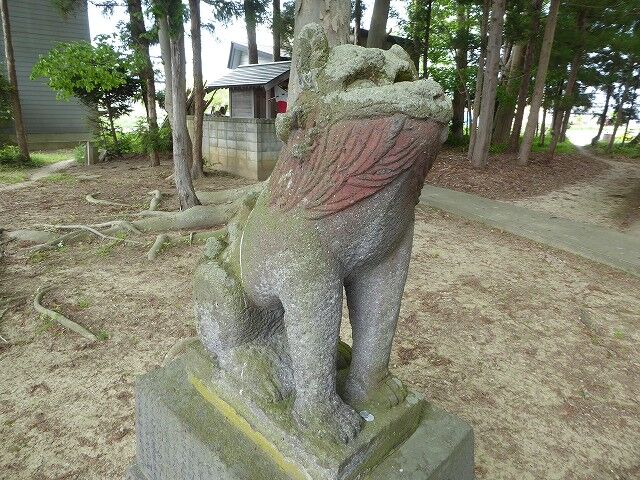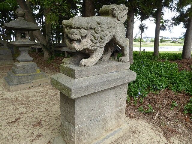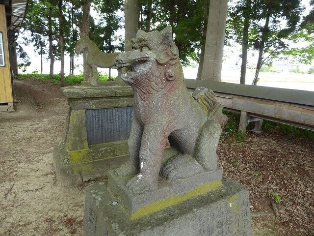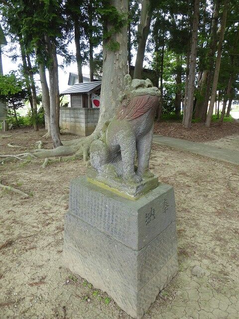 神武之爾ゝ乃古木之森ゝ可詮平川主水木絶■以岩城山之不改容足徴此山此水固與天壌無窮矣平水西岸林越欝葱有古叢祠是乃村社而世為葛西氏所崇祭也氏其姓平出平清重乃大光寺氏支強也枕平川營野田主居焉鎮數村為土豪而其宗家七當此時東有三戸氏西有安信氏或侵或襲遂為所滅是以遺族遠避關東恢復是謀久之而天運屬恭為偃武右文之世乃新創一村付奮村名曰日沼乃日沼村是也明治十■年得■官■建■社宮於塁趾■合祀遠袒所崇之大汝■彦名ニ神靈二神者義兄弟■■一心経營天下乃為顕世蒼生乃畜産定癒病之■又為攘恩■■■■災害成禁■之法■■百姓■■■家恩頼夫神也者■■■而降禍福也故■■福自我得之■可不敬■■■■氏有所■■立石造金■■願是■同族有志■■■■助工事者四十餘名蓋狻猊者猛威之歎也一哮■百獣伏再吼則百鬼■豈不虣哉二事竣功■之祠可永鎮神慮且祈■村■昌云 弘前石工山内三次郎
