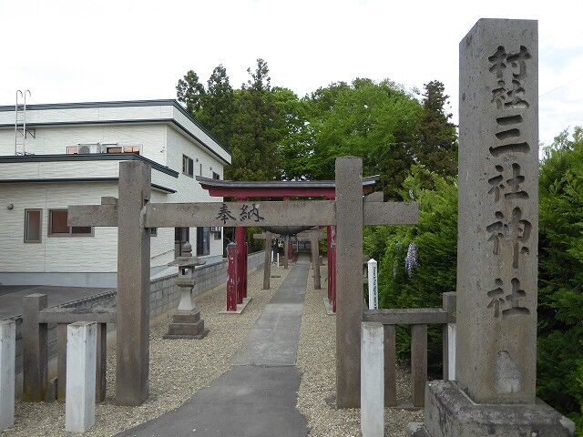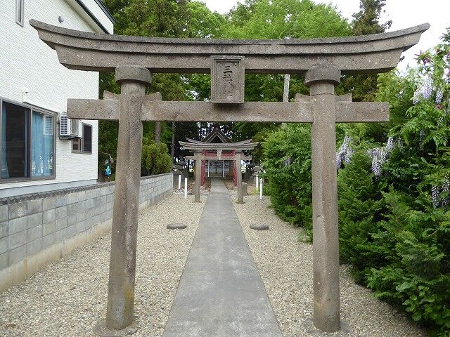 村社三社神社御事歴…『祭神:天照皇大神、譽田別尊、天兒屋根命、大己貴神、少彦名命。祭日:例祭五月八日、祈年祭四月一日、新嘗祭十二月十六日。境内地:三百四十五坪九合六勺。財産土地:原野壹町貮反六畝、田地三反貮畝貮拾九歩。氏子:九十八戸、崇敬者百貮拾戸。本社の創立年代は不詳なれど古くより庶民の崇敬ありて明治十三年五月八日衆庶參拝の許可を得久しく當村字李田、葛西利三郎氏邸内に祀られしを大正三年七月十日樋口甚左衛門氏邸内社、少彦名神社と社殿を合併して現地へ奉遷す。爾来本村の氏神と定められ氏子四氏の崇敬年と共に加はり恒例臨時の祭祀には至誠恭敬の實を擧げ特に維持経營を確立する為め土地財産を造成して神域社殿施設の整善を圖り鋭意御神徳の發揚に努めたる結果大正十三年五月十五日村社に列せられ仝年六月二十四日神饌幣帛料供進神社に指定せらる。右は本社沿革の大要なるが神社崇敬の資として之を永代に傳ふ因みに本碑は奈良才助氏一生の厄年に當り御神恩報謝の一端として記念の為め自力奉建に係るものとす。紀元二千五百九十二年十二月八日社掌山谷清貞謹誌』