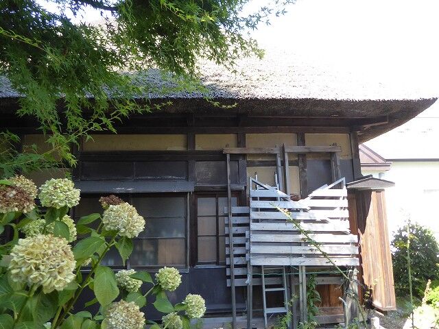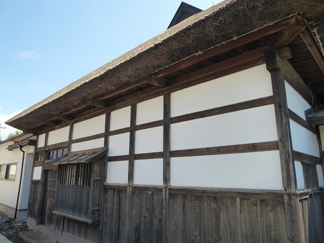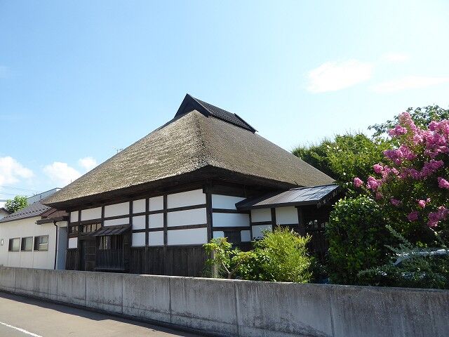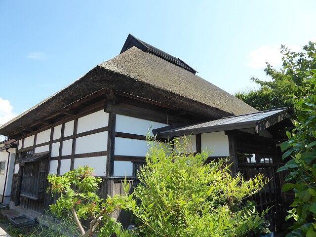 江戸時代の建築。建築面積114㎡。東西に長い敷地のやや西寄りに西面して建ち、桁行6間、梁間5間、木造平屋建、寄棟造、茅葺屋根。北西隅に玄関を設けており、6畳間を続け、南西隅に12畳間の座敷を設けています。その奥には9帖の茶の間と8帖の押入れ付きの和室がありますが、和室の押入れは後から設置されたもので、建築当初は9帖であったと推定。床構えも古い形式を残し、全体に残りもよく、上級武士の住宅として貴重ことから国登録有形文化財となっております。