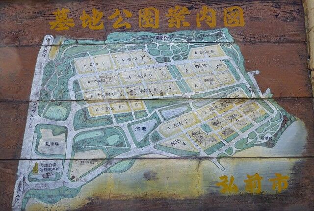 弘前市墓地公園(弘前市小沢)です。墓地公園案内図には墓地以外に、展望台が2ヵ所、溜池が1ヶ所が記されています。
