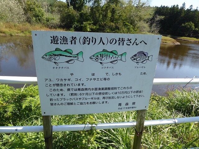 こちらの看板は文章が一部だけ綺麗に消えているのか意味が通じません。せっかくなので転載しておきます…『やはで、しかもため、アユ、ワカサギ、コイ、フナやエビ等のことが懸念されています。このため、県では青森県内水面漁業調整規則でこれらのしています。(以下省略)』