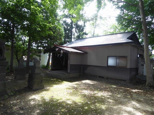拝殿。東面、間口4間半、奥行3間、寄棟屋根。御祭神は天照皇大神。例祭日7月16日。境内地193坪、本殿0.5坪、拝殿15坪。草創年月不詳ですが寛永年中の勧請といいます。昭和21年3月29日宗教法人令により届出、昭和25年2月28日境内地無償譲与許可。拝殿内には岩館松明囃子保存会奉納の十二支の絵馬や古い天照大神の奉納絵2枚(昭和30年岩館婦人一同、明治)等が飾られ、右におしら様、左に木製の御神馬があります。