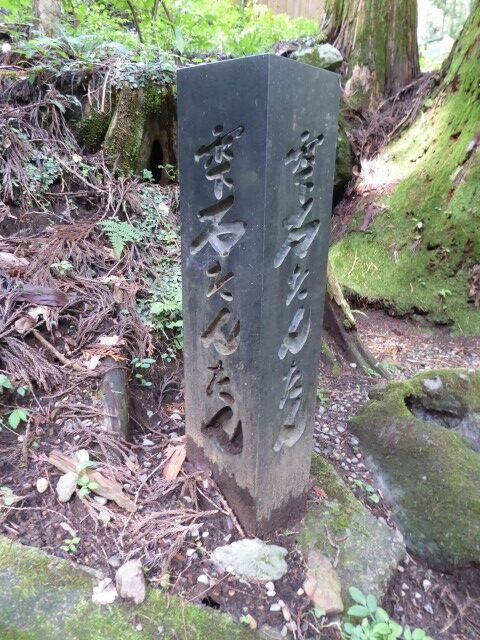 杉の根元にある洞窟と雫石たんたん碑。洞内の滴の音は聞こえませんでした。