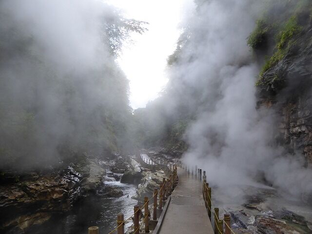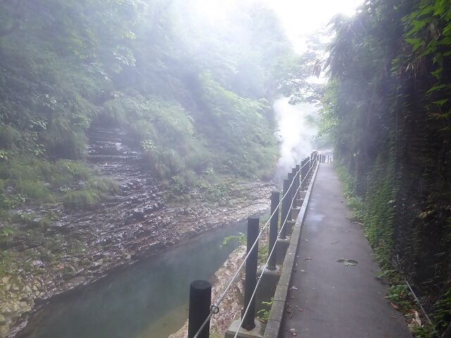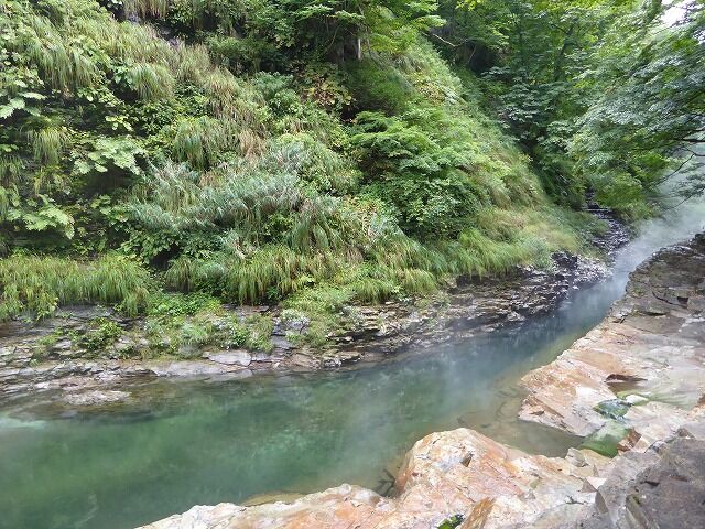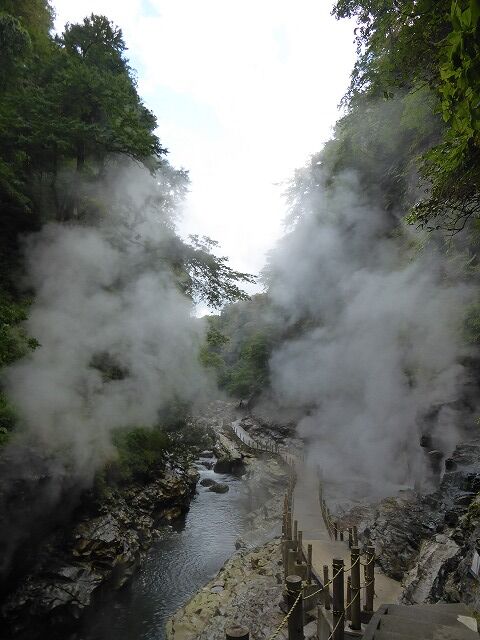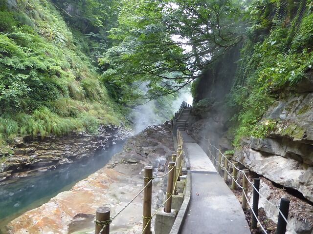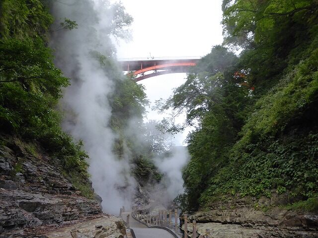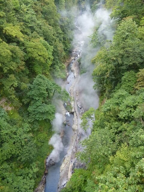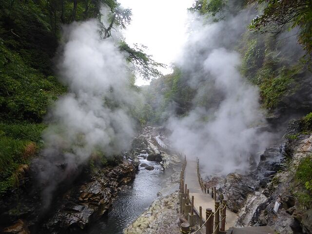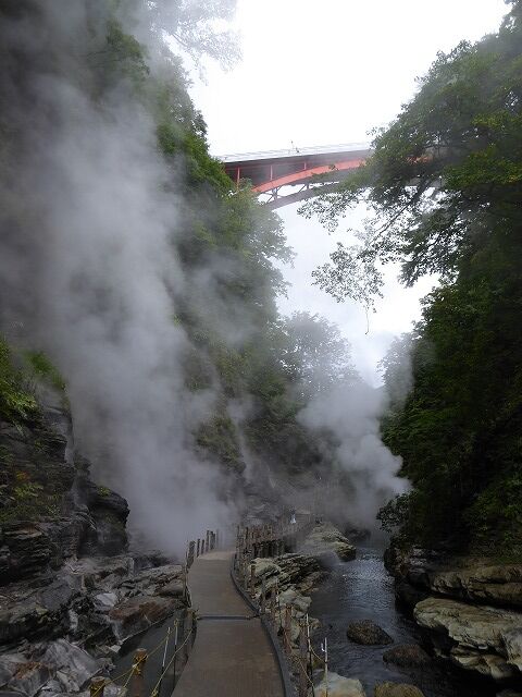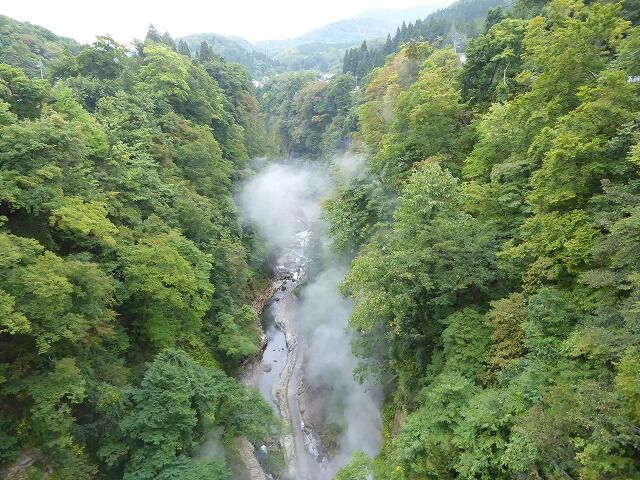 パンフレットより…『通称「地獄釜」と呼ばれ、小安峡随一の景勝地として知られている大噴湯。皆瀬川の急流が長年にわたり両岸を深く浸食してきた落差60m・長さ8kmにおよぶV字谷。遊歩道や橋から、高温の蒸気と温泉が噴き出している様子を見ることができるよっ。!!』