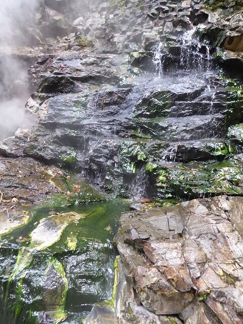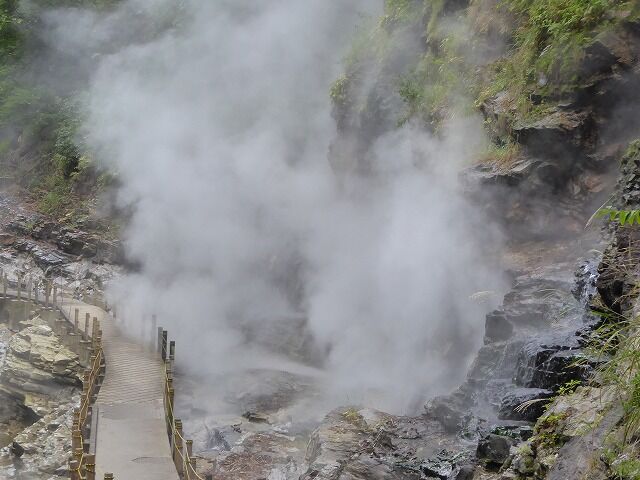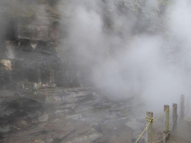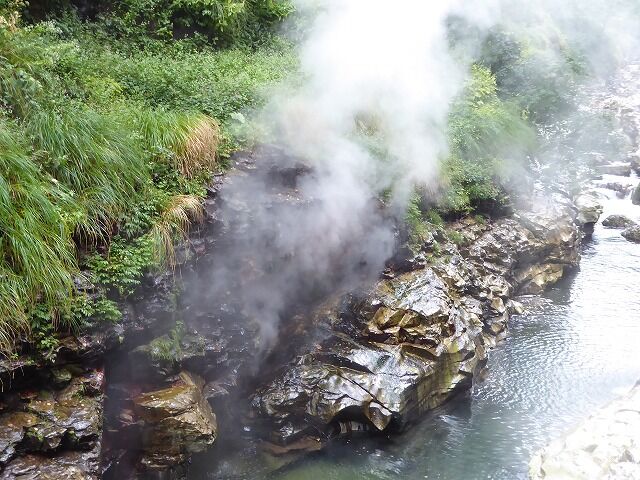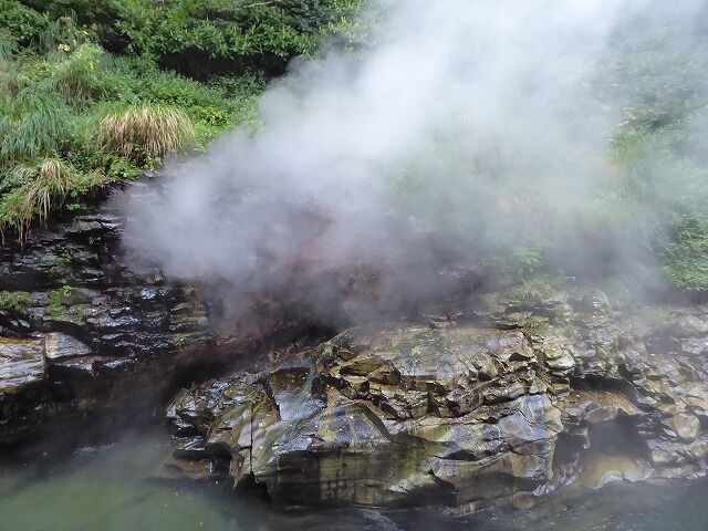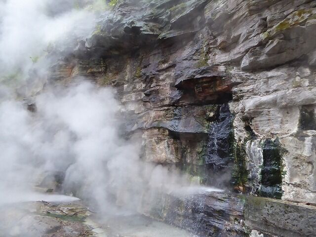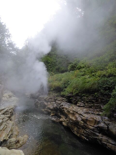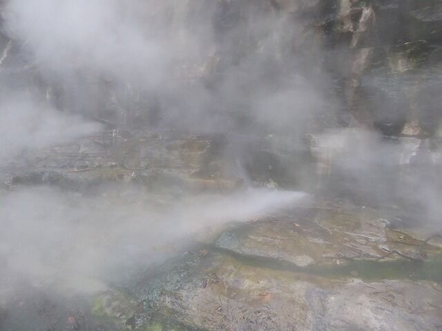 大噴湯(体感!地球の息吹-Feel the breath of the earth!)より…『大噴湯では、岩の割れ目から、高温(98℃)の蒸気と温泉がふき出しています。このような現象は、地下に染み込んだ雨や雪解け水が地熱で熱せられ、熱湯や蒸気となって地上にあらわれるために起こります。皆瀬川が60mも大地を削った結果、普段は目に見えない地熱を目の当たりにできる、まさに地球の息吹を体感できる場所が生まれたのです。』