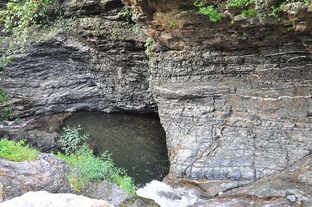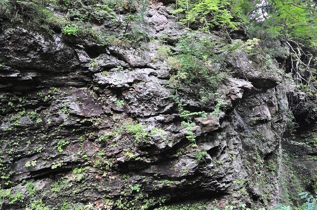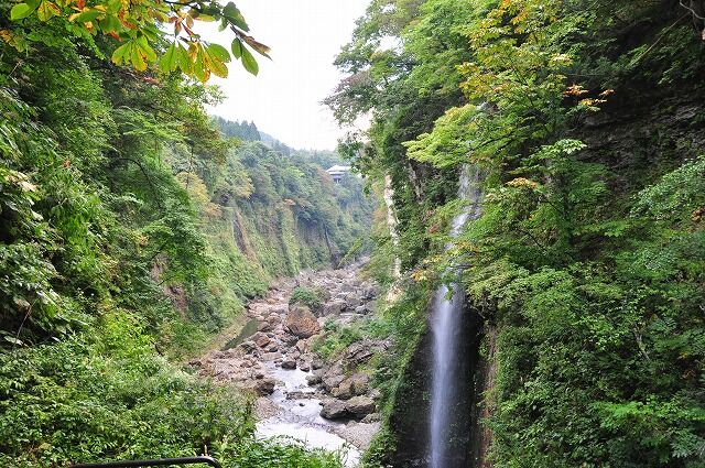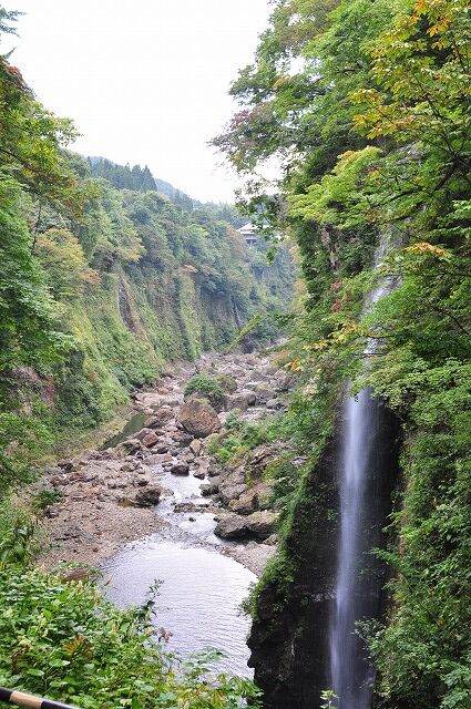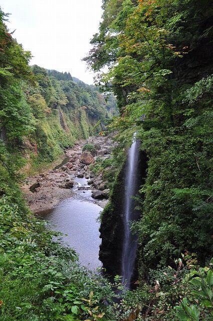 案内板「不動滝」(小安峡がここで終わった理由)より…『不動滝の形成には温泉が関わっています。この場所で湧く温泉のシリカ成分は、長い時間をかけて地層のすき間に染み込み、周辺の岩を硬く変質させました。そのため、皆瀬川は不動滝より上流の大地を削ることができず、小安峡はここで終わりました。こうして出来上がった段差により、不動滝が生まれたのです。』