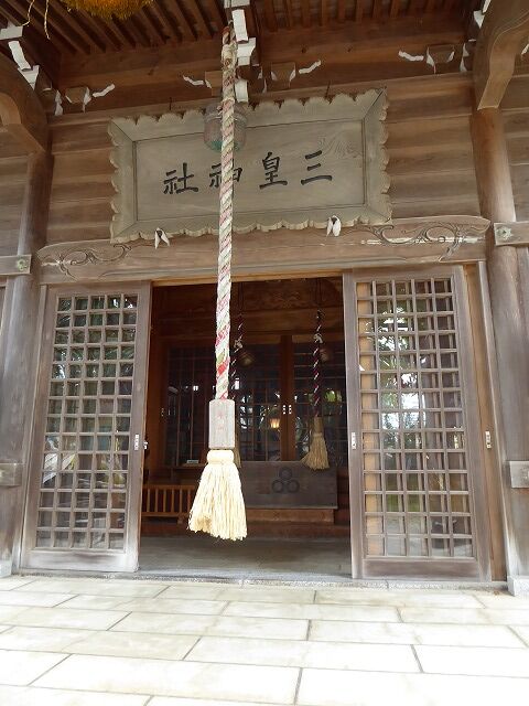 公式HP参照…『創立年月日不詳なれども、再建は桓武天皇の延暦年間(延暦23年・804年頃)征夷大将軍坂上田村麻呂が竹原三光の神に祈誓して高清水の丘に向って矢を放ったといわれており、賊を討った報賽として社殿を再建したという。境内には田村麻呂将軍の杖に根がついたというブナの大木があり、戦前まで地上八尺位の所から、こんこんと水が流れ、「霊水の大木」といわれ、霊水は眼病に効くと言われていた。また、現在は枯れてしまったが、田村麻呂将軍の弓の弦を掛けたという松が、「弦かけの松」といわれ、参道中央にあったことが知られている。慶長5年(1600)に本宮の御分霊を受け、熊野神社(現在の里宮)が遷座される。江戸時代以前より三光大神として「日・月・星」をお祀りする神社といわれており、「六郷郡邑記」享保15年(1730)には、当社は「三光宮」との記述があり、また菅江真澄の「遊覧記」文化12年(1815)にも、「竹原三光宮トテ日月星ヲ斎クニヤ云々」と記述されいる。ちょうど当社は、秋田藩主、佐竹氏の久保田城より南西の裏鬼門の方角にあたり、また牛島は参勤交代で江戸に向かうための交通の要でもあり、秋田藩主、佐竹氏の五本骨月扇紋が付された文久年間に制作された獅子頭(猿田彦大神として奉齋)が伝わっている。他にも江戸時代後期に奉納された狛犬(嘉永7年)、御神鏡(安政2年)、手水鉢(文久2年)、三皇大神宮の碑(元冶元年)がある。安政2年の御神鏡には、「竹原三皇宮」と初めて三皇という名称が記されており、この当時に三光から三皇という社名に推移したものと伺われる。明治7年村社に、明治33年に本殿と拝殿が再建された。明治41年、日神饌幣帛料供進神社に指定される。明治44年、大野中道上段無格社八幡神社を合祀。明治44年、古川端無格社神明社、同年村社熊野神社(現在の里宮)を合祀し、三皇熊野神社と名称が変わる。昭和48年に幣殿を増改築。平成5年に本宮社務所を新築。現在の社殿は平成16年に本宮御鎮座1200年、里宮御鎮座400年を記念し御社殿を全面改築、客殿を新築したものである。境内社として三皇稲荷神社をお祀りしている。尚、境内には、ぶな、けやき、えんじゅ、いちょう等の大樹に、元治元年(1864)の三皇大神の碑をはじめ、保食神、安藤和風の句碑などあり、遠近の人々から三皇さん、竹原さんのもりとして親しまれている。』