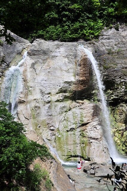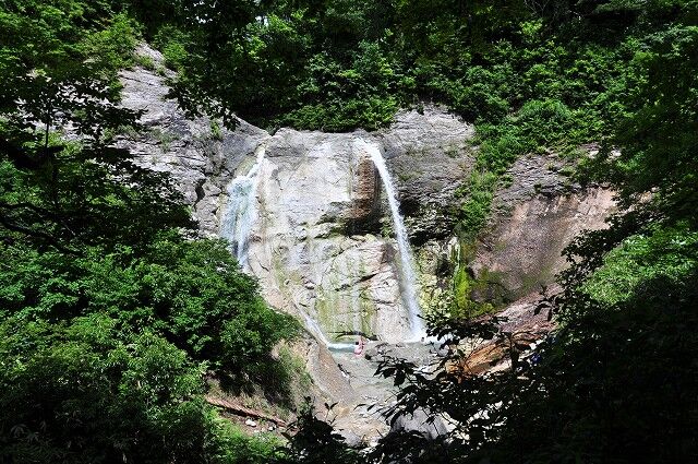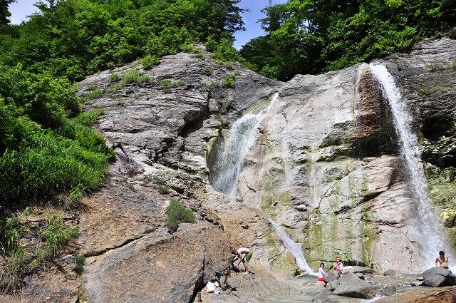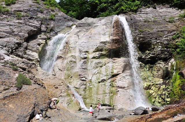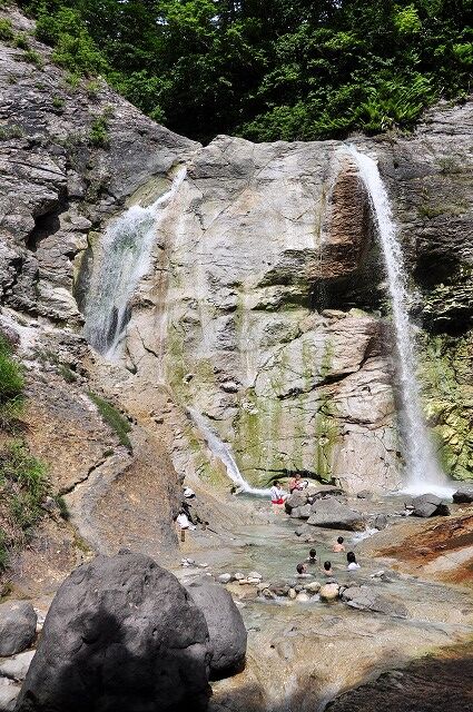 川原毛大湯滝「大自然がつくった天然の打たせ湯」…『川原毛大湯滝は、滝そのものが温泉という全国でも珍しい滝です。落差は約20mで、滝つぼや渓流は天然の露天風呂になります。温泉は、滝より上流で湧き出ており、お湯の温度は98℃で、強酸性です。途中で沢水と混ざり、夏の間はちょうど良い湯加減になって流れ落ちてきます。【注意事項】1.入浴適期は、7月上旬~9月中旬です。(湯加減は水量や気温次第です)2.入浴する際は、水着を着用してください。3.皮膚への刺激が強い、強酸性の湯です。』