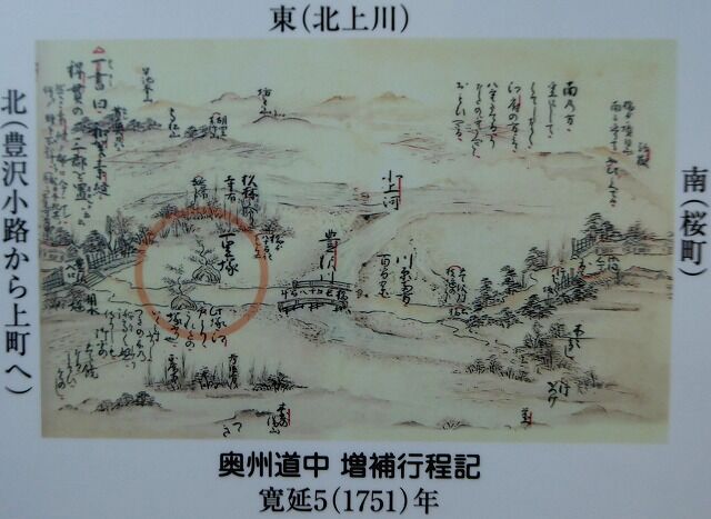 豊沢町一里塚(錦塚)…『慶長9(1604)年、江戸幕府は各街道の起点を日本橋と定め、一里(3.927km)ごとに道の両側に5間(9m)四方の塚を築かせ、木を植えさせた。奥州街道のうち、盛岡から北上の間は慶長15(1610)年頃完成する。豊沢町一里塚は、里川口第4地割字川原93番地の1(現豊沢町5番21号 同6番24号付近、この現在地の由来案内板の西約30m)にあり、面積25歩(約83㎡)、高さ15尺(約4.5m)、江戸の日本橋から130里の距離にある。この一里塚は奥州街道から分岐する土沢道、岩崎道など地方主要道の起点となり、城下町花巻の表玄関のシンボルとして錦塚の別称をもって威容を誇っていた。塚に植えられていた樹種は東側は槻木、西側はケヤキと伝えられている。豊沢町一里塚は明治12年まで現存していた。この付近の地名を「もりのね」と称している。平成26(2014)年8月豊沢町振興会』※資料:永田圭一氏「会報豊沢町」昭和55年、一里塚雑感より