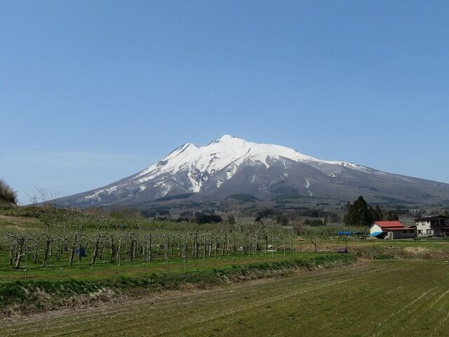 坂下にある開墾紀念碑…『抑々此ノ開墾地ハ寛政年間ヨリ宮地村ニテ愛護セル地ニシテ明治十五年産馬共同社ヲ設立シ畜産ヲ計リタルモ明治四十四年創設セシ保護組合ニヨリ大正二三年ニ亘リ栗ノ造林ヲ完成シ地方稀ニ見ル美林ナリシ䖏ナリキ大東亞戦争終戦ト共ニ急速ニ逼迫セル食糧ノ缺乏ニ堪エス永遠ノ救濟ヲ計ル為メ開墾組合ヲ組織シ昭和二十一年三月二日縣知事並營林局長ニ開墾ヲ出願國有林ノ貸下ヲ受ケ栗松約三千石ノ伐採後組合員九十三名ニ土地ヲ分割鍬下ヲナシ晩秋ノ風雪早春ノ烈霜ト闘ヒ辛苦艱難遂ニ開墾ヲ完成セリ謂フニ此ノ事業ノ達成ヲ見タルハ關係官廳及團體ノ支援ニ依ルト雖モ亦以テ弘前營林署長農林事務官井上省一氏ノ明快ナル裁断ト村長三上重造氏ノ絶大ナル指導鞭撻ト聰明ナル見識ト盡瘁ニ俟ツシモノ實ニ多シ茲ニ地方産業開發ニ関スル事績ノ梗概ヲ右ニ勒シ永ク後世ニ傳ヘントス 岩木村農業會長 笹兵治撰 髙山松堂書』