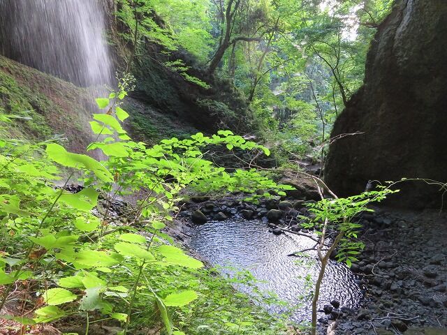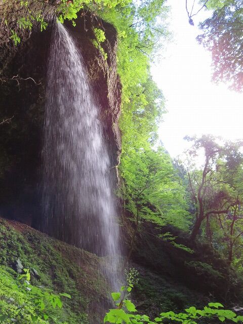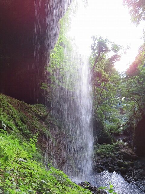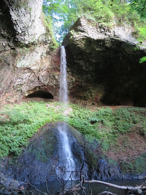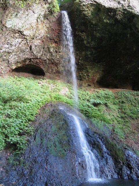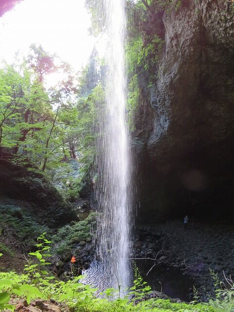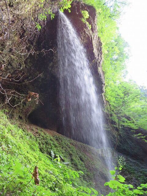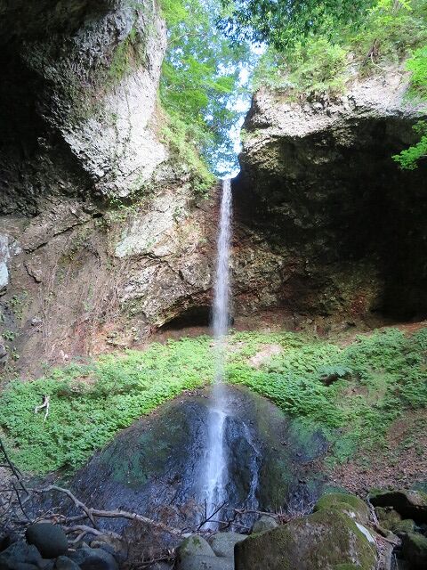 Wikipediaより一部抜粋…『銚子の滝は秋田県山本郡藤里町 にある滝。滝つぼの形が徳利に似ていて、滝の水が注がれているように見える滝である。銚子の滝は、滝壺の周囲全体に丸みがあり、昔の徳利に似ていてその徳利に上から酒(滝の水)がそそがれているように見えることから「銚子の滝」と呼ばれるようになったと言われる。 また、先人たちは滝口が突き出ていたことから「提子の滝(ひさげのたき)」とも呼んでいた。滝の上流にはマンガンの鉱山や、付近には化石入玉髄瑞鳥石が産出され地質の構成では貴重な地である。滝と深くかかわりのある湯の沢神社の祭神は不動明王で、開基は不明だが六郡郡邑記(1730年)によると「湯野沢村貞享年代(1680年頃)開発14軒」と記されており、温泉の発見と併せその頃と思われる。明治初期、秋田藩士石井忠行の「伊豆園茶話」の一節に、湯の沢の滝は藤琴にあり「裏見の飛泉なり」と記述され、滝の下に入ると岩に囲まれた滝の裏を覗くことができるとしている。これは寛政元年(1789年)の井口経包の「御界巡回日記」では「湯の沢の滝(美琴)は美人の恨み粧ひならん」とされ「泪にぬれし妹が黛(まゆずみ)仇に過ぎゆく心ならめや思ひにたへぬ水のみなもと人をうらみの滝と云らん」と歌われている。石井忠行はこれを引用してさらに地名を修正して歌を解説する形で抜粋している。昭和11年の「観光の栞」では「滝壺の近くに洞窟があるので、そこに入ってみると裏見の瀧である。岩窟は3-40人をいれるに足り、水しぶきにぬれる憂いがない。夏知らずの仙境である。土用の日には近在から湯治客が入り込んであたかも芋を洗うような光景を呈するが、この岩窟のなかで酒を汲みながら裏見の瀧としゃれるものも少なくない。瀧を取り巻く岸壁には樹木が生い茂り、洞窟にはアマツバメの巣がある」と書かれている。銚子の滝にも、江戸時代の旅行家、菅江真澄が訪れている。その時に詠んだ和歌「藤かつらくりかえし見るいわがねにかかるも高き滝のしらいと」の歌碑が設置されている。』