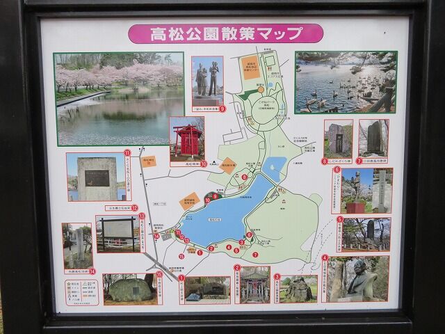 高松公園散策マップ。紹介されているのは、①村上昭夫誌碑(村上昭夫は1927年大東町生まれの詩人で、岩手中学校卒業後、ハルビン省庁に勤務。戦後、シベリアで2年間の過酷な抑留生活を経て帰国しますが1950年に結核発病。闘病生活は1968年41歳で亡くなるまで続きました。唯一の詩集「動物哀歌」は土井晩翠賞、日本現代詩人会H氏賞を受賞し、生命への深い愛と祈りをこめた詩は、多くの人たちに愛されています。市立図書館側に「動物哀歌」の1作『私をうらぎるな』の詩碑が建っています。)、②桜地蔵尊(桜霊閣。高松の池の南岸にある「桜霊閣」には、高松の池開発に貢献した物故者の功徳と桜の霊を一緒に顕彰する地蔵尊が奉られています。昭和5年5月に盛岡市長として5期20年在任された北田親氏氏の尽力により建てられたもので、正面左側に狐、右横の斜面にはお多福の面と猿、後ろの斜面に天狗の面と狸の像が配置されています。)、③高松公園菖蒲園碑、④北田裸城翁北田親氏像(昭和丗年五月造之 吉川保正作)、⑤弔霊塔六烈士氏名碑(「大纛斯発軍勢 愈揚偉矣六士 遠人氈郷伐課 不果子涂而僵 一死慘烈千載 流芳神庭山上 建像焚香櫻華 萬朶浴以朝陽 北田親氏誌 六烈士氏名 盛岡 横川省三 四十歳 長崎 沖禎介 廿八歳 延岡 松崎保一 三十歳 宮崎 田村一三 廿四歳 滋賀 脇光三 廿三歳 熊本 中山直熊 十八歳 昭和七年六月二十六日建」※隣に横川省三の銅像(台座のみ)…横川省三は明治時代に自由民権運動家、新聞記者、北米での農業経営、ハワイ移民斡旋、日露戦争での特殊任務従事など、波瀾万丈の生涯を送った盛岡の先人で、昭和7年、当時の北田市長の尽力で高松の池南岸の神庭山に銅像が建立されました。その後、第二次世界大戦時の金属回収で撤去され、現在は台座のみが残っており、銅像の石膏原型は、盛岡市名須川町の報恩寺に保管・展示されています。)、⑥「ひまわり」シベリア抑留平和祈念慰霊碑(祖国の犠牲となった尊い御霊を鎮め、世界の恒久的平和を祈念して建立した記念碑。「ひまわり」はこの碑の建立に併せて、平成6年10月12日、シベリア抑留経験をもつ佐藤忠良氏が制作し、財団法人全国強制抑留者協会岩手県慰霊碑建立委員会が設置したもの。第二次世界大戦終結に際し、ソビエト連邦はポツダム宣言に違反し、満州、樺太等から日本軍人などを強制連行して重労働を課しました。岩手県からは約8000人が連行され、1200人を超える同胞が過酷な労働と飢餓、酷寒によって死亡。この犠牲者のほとんどは未だ異国の凍土の中に墓標のないまま眠っています。)、⑦小田島孤舟歌碑(「われひとり よのつねびとの みちこえて しづかにゆかむ さびしかれども」孤舟が47歳の時に詠んだ歌で、門下生たちが昭和8年4月、孤舟の生誕50周年を記念し神庭山に建立)、⑧しだれざくら碑、⑨「望み」平和祈念像(戦後50年を記念し「核兵器のない世界を目指し、不戦を誓う平和記念像」として、県の生協・青年・婦人・原爆被害者の市民団体の提唱に賛同した2万人を超える岩手県民の募金を集め、増山俊春が制作(舟越保武監修)し、(平成7年9月5日に平和記念像建立推進委員会が建立したもの。)、⑩高松明神(別記事にしております)、⑪さくら名所100選の地碑(下記参照)、⑫壬生義士伝由来(下記参照)、⑬高松公園由来(下記参照)、⑭名勝高松池碑(大正12年建立、米内上田青年会)、⑮平野直文学碑(「かたくりは、春一番に咲く花です。きびしい冬の夢からいまさめたように、あざやかな紫色をしていました。直」)※説明等は私が追記