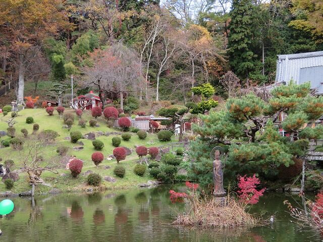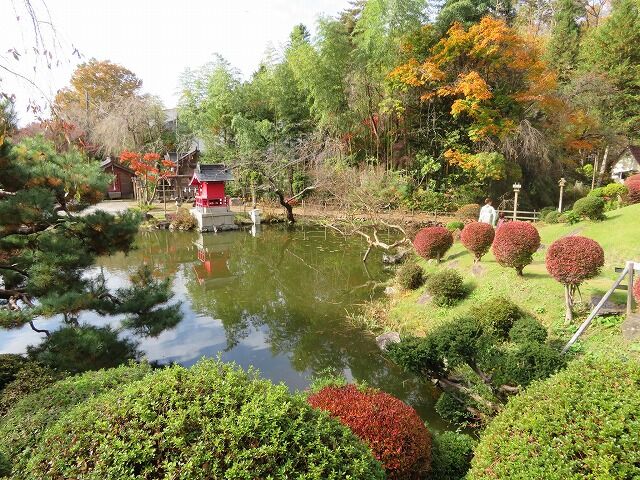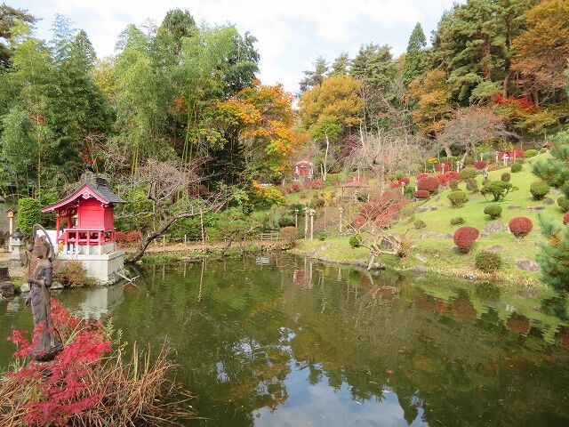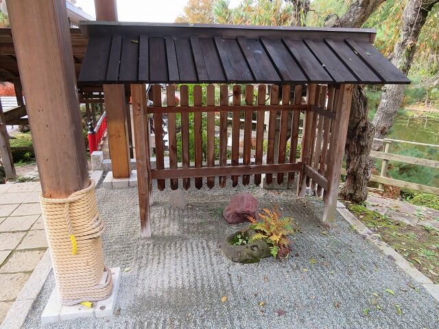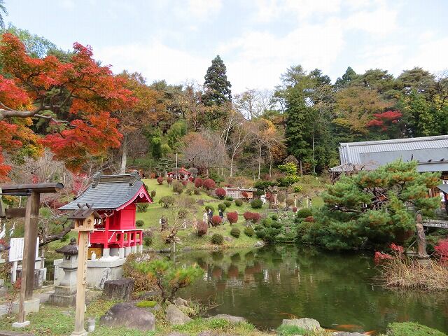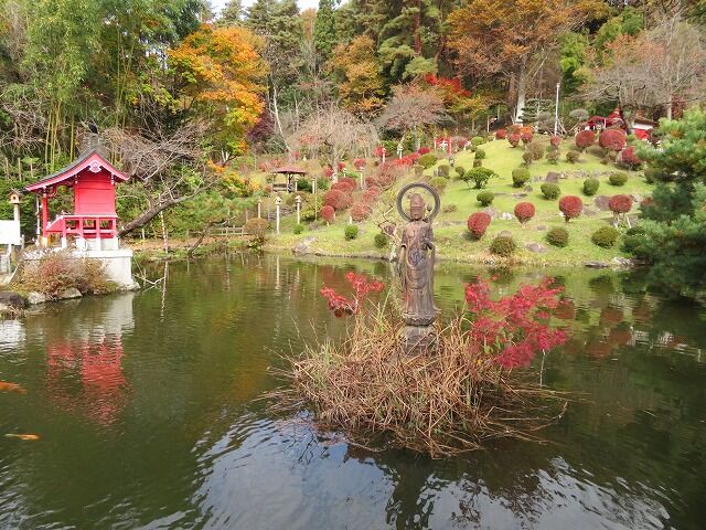 心字の池…『寛永年間方長老師の作庭により造った池で心の字の形から「心字の池」の名が付けられました。現在は点の一つが拝殿の建立により無くなってしまいました。池の中の観音像は作庭の秘法によるもので中に観音経が納められております。この池を渡ることにより皆さま方の方体を清められると云う信仰があり、又池には数百尾の鯉が生息しております。』