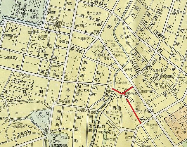 【山道町】…江戸期より現在に残る町名。明治初年から明治22年は弘前を冠称。江戸期は弘前城下の一町で武家地。城郭の南東に位置。品川町から土淵川に至る道筋の町で、東北に土手町が並行しており西南に住吉町が接します。万治2年の津軽弘前古絵図において不完全ながら町割りが見られ、侍丁として屋敷17軒が認められます。寛文13年の弘前中惣屋敷絵図では不完全ながら町割りがなされ、侍丁とあり19軒、うち10軒の侍屋敷のほかは空家。また、同図によりますと土手町からの入口に山道とあり町名はこれに由来すると推定。元禄13年の弘前侍町屋敷割には土手山道と見えます。明和元年の藩律では城東の士街として武家屋敷20軒があります。寛政改革による藩士土着令により町内の藩士が在方へ移住したため、寛政5年には御家中潰町の一つとなりました。土着令解除後の享和3年の御家中町割には武家屋敷24軒が見えます。明治初年の国誌によりますと戸数32、「上は品川町より下は土手町に至る、長一丁五十八間四尺、巾四間」と見えます。明治22年弘前市に所属。明治期以降武家屋敷街から住宅街として推移していきましたが、同30年南東の旧富田村に陸軍第八師団が設置されたことにより、東端品川町との堺が通称富田大通りの一部として繁華街となり、大正3年当市最初の常設映画館である慈善館が作られました。明治29年に弘前市に入った聖公堂が市内各所に講義所を設け、同33年当町西端に教会を開き山道町聖堂と称しました。同教会は同36年に伝道の目的を兼ねた裁縫塾を開き、これが大正14年から聖公会女学院となりましたが、昭和5年に廃止され、明星保育園を置き、これが明星幼稚園となりました。なお、聖堂は大正10年に新築されて弘前昇天教会と称しています。明治末期に境橋を経て北川端町へ通じる道ができ、昭和27年弘前電気鉄道(弘南鉄道大鰐線)が開通、当町南側に中央弘前駅が設置されると当町西端部も大きく変貌。昭和3年の賦課戸数27。同31年一部(中央弘前駅を含む地域)が吉野町となります。世帯数・人口は同25年38・238、同50年26・92、同55年21・78。