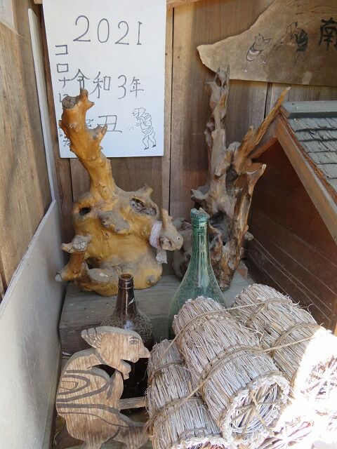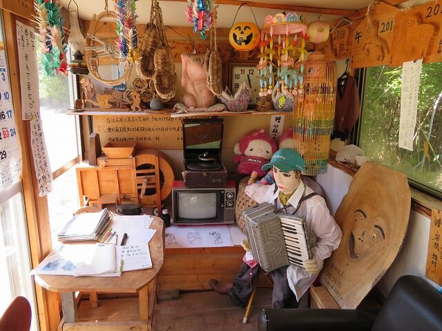 「昔は石屋で名高き荒田村。今はカラクリ人形で名を馳せし奥利義美様。更なる健闘を祈る。バス停待合所建築記念 H26年12月28日荒田住民一同」