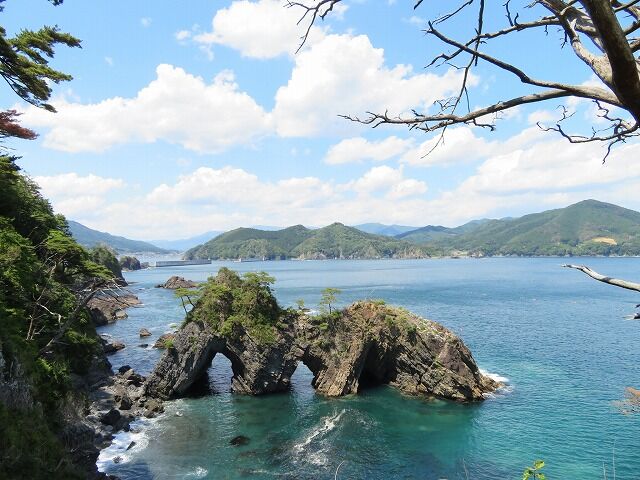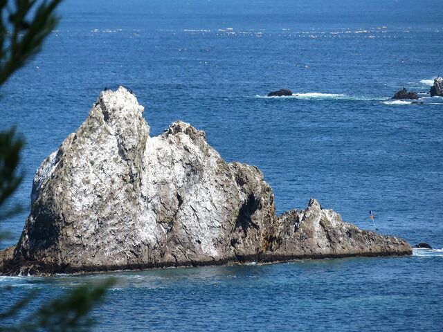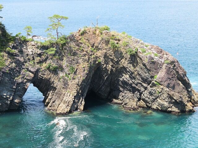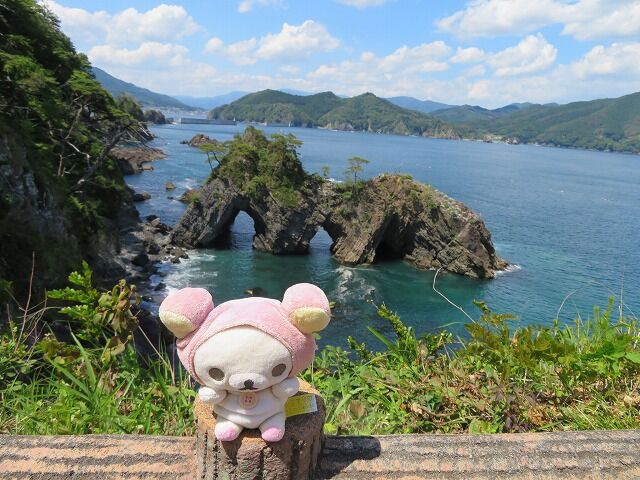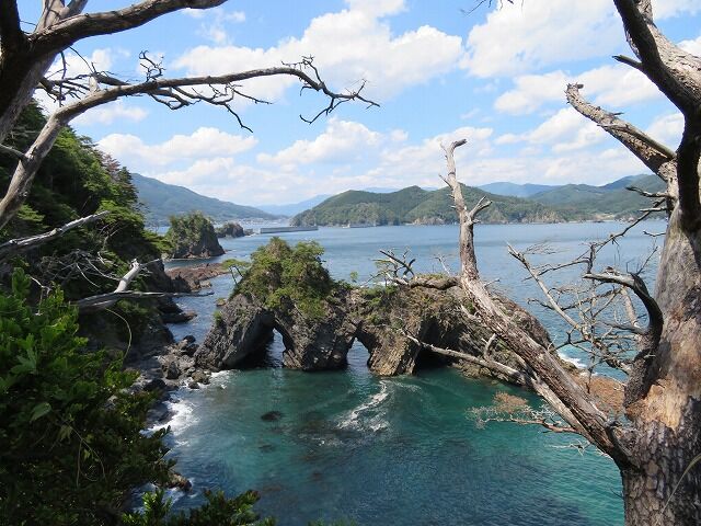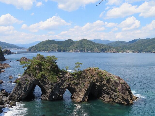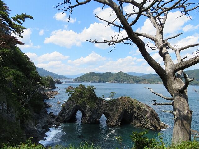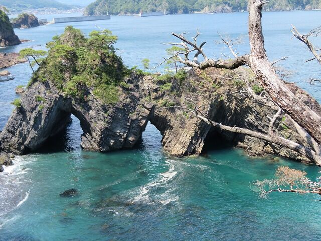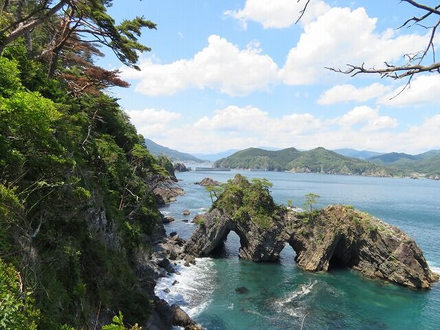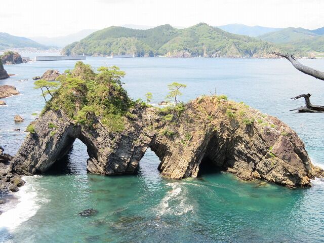 穴通磯(令和2年2月環境省・岩手県)…『大船渡市末崎半島の南東端約6kmの海岸線は「碁石海岸」と呼ばれ、約1億3千万年前(中生代白亜紀)の海に、砂粒の固まった層と泥の固まった層が交互に堆積し岩盤になったものがせり上がってできています。「穴通磯」は、もろくなった地層が波によって削られてできた3つの穴が開いた奇岩です。』・『The"Goishi Coast"is extending about 6kilometers along the southeast edge of the Massaki Peninsula,consist of the piled up on the seashore made by both mass of sand and mud layer alternatively which created 130million years ago,during the Mesozoic Cretaceous Period."Anatoshi-iso"is a strange shape rock which has three holes made by sea waves.』