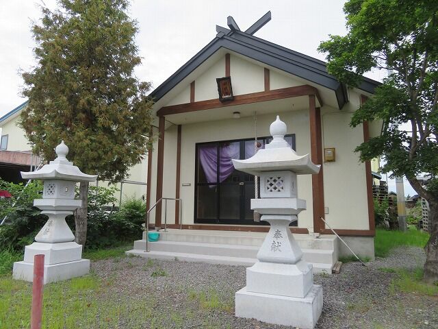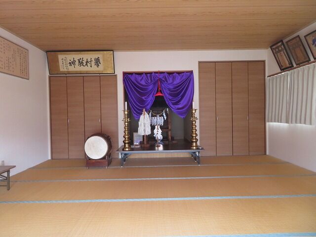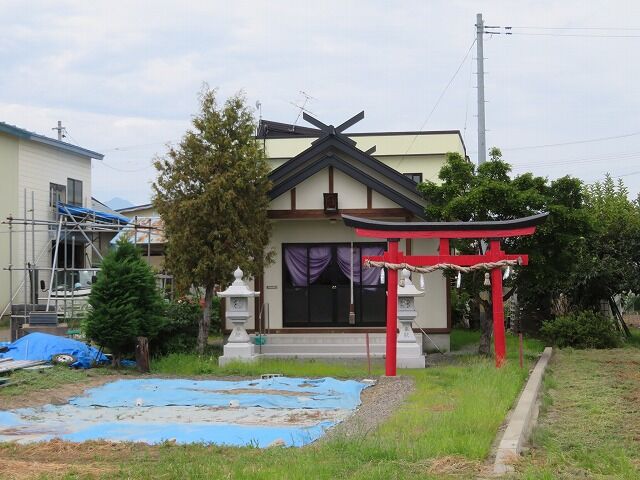 大光寺史より…『当社は、館山神明宮より二百㍍ほど離れた部落入口にあり、道路から用水路沿いに作られた狭い畦道のような参道を百㍍ほど進むと田地と境内界の入口に朱塗の鳥居一基が建ち、およそ四間に六間ほどの境内地にかえでの大木が一本と、明治二十年六月十六日、対馬善助奉献の石灯籠一対と間口二間半、奥行二間のトタン板葺切妻屋根の社殿が南面して、ひっそりと建てられている。一見、部落内を通る道路から見ても、他の神社境内と違い樹林ではないので気がつきにくいところである。』
