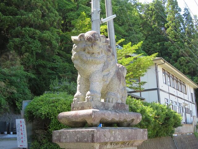 大手水石…『文化5年(1809年)藤原の古舘卯右衛門が神恩感謝のため願主になり、宮古周辺各村に呼びかけ黒田の山奥から3年がかりで約のべ1万人もの人力をかけて運んできたものです。その後明治39年その子孫古舘熊之助外氏子総代により加工調刻が完成奉納されました。寸法は長さ約4m、厚さ約2.3m、高さ約3mです。この工事に協力した村々は次のとおりです。八木沢村、磯鶏村、髙浜村、金浜村、津軽石村、長沢村、花輪村、松山村、田鎖村、根市村、千徳村、近内村、小山田村、山口村、崎鍬ヶ崎村、鍬ヶ崎村、宮古村の十七ヶ村です。』