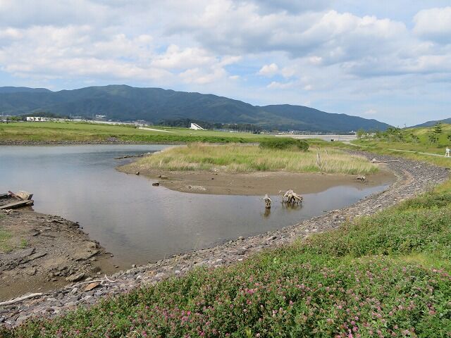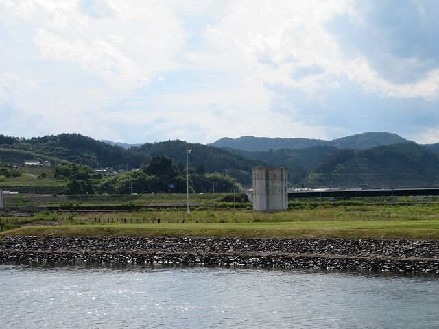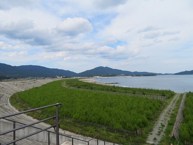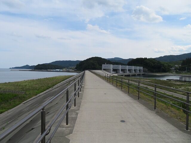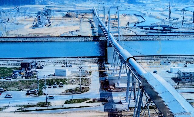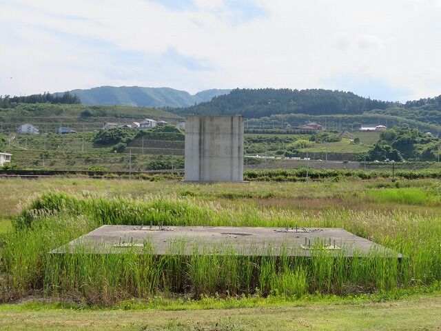 希望のかけ橋とベルトコンベアの基礎(Dream Bridge(Kibou-no-Kakehashi)and the foundation of the conveyor belt)…希望のかけ橋『東日本大震災津波で壊滅的な被害を受けた陸前高田市では、高さ10m以上に及ぶ市街地のかさ上げ盛土工事が行われました。その工事で土砂を運搬した巨大ベルトコンベアとそのためのつり橋希望のかけ橋の基礎部分が、ここに残されています。気仙川をはさんで、高台の宅地造成のために掘削した土砂を、市街地のかさ上げ盛土用に運んだベルトコンベアは、幅1.8m、全長3km。2014年(平成26年)3月末から2015年(平成27年)9月までの稼働期間中に運んだ土砂は500万㎥。これはかさ上げ盛土に必要な1,200万㎥の約4割にあたり、10tトラックなら9年ほどかかる運搬作業を1年半に短縮しました。市内の小学生に公募し決定した愛称は希望のかけ橋。「まちの復興と未来へのかけ橋に」との願いが込められました。』・復興遺構として後世に伝える『2015年(平成27年)9月まで稼働し、被災した市街地のかさ上げ盛土工事の工期短縮に大きな成果をあげた希望のかけ橋とベルトコンベアは、2016年(平成28年)から解体が進む中で保存の声が上がり、気仙川をはさんだ基礎部分の保存が決定しました。ベルトコンベアと橋の設置に当たっては、土砂のスピーディーな運搬はもちろん、サケやアユが遡上する気仙川の環境にも配慮し、河川内に支柱を建てる必要のないつり橋構造が採用されました。復興への道のりは長く険しいものです。希望のかけ橋は、長期にわたるこうした復興過程を後世に伝える場所として、その新たな役割を果たしています。』